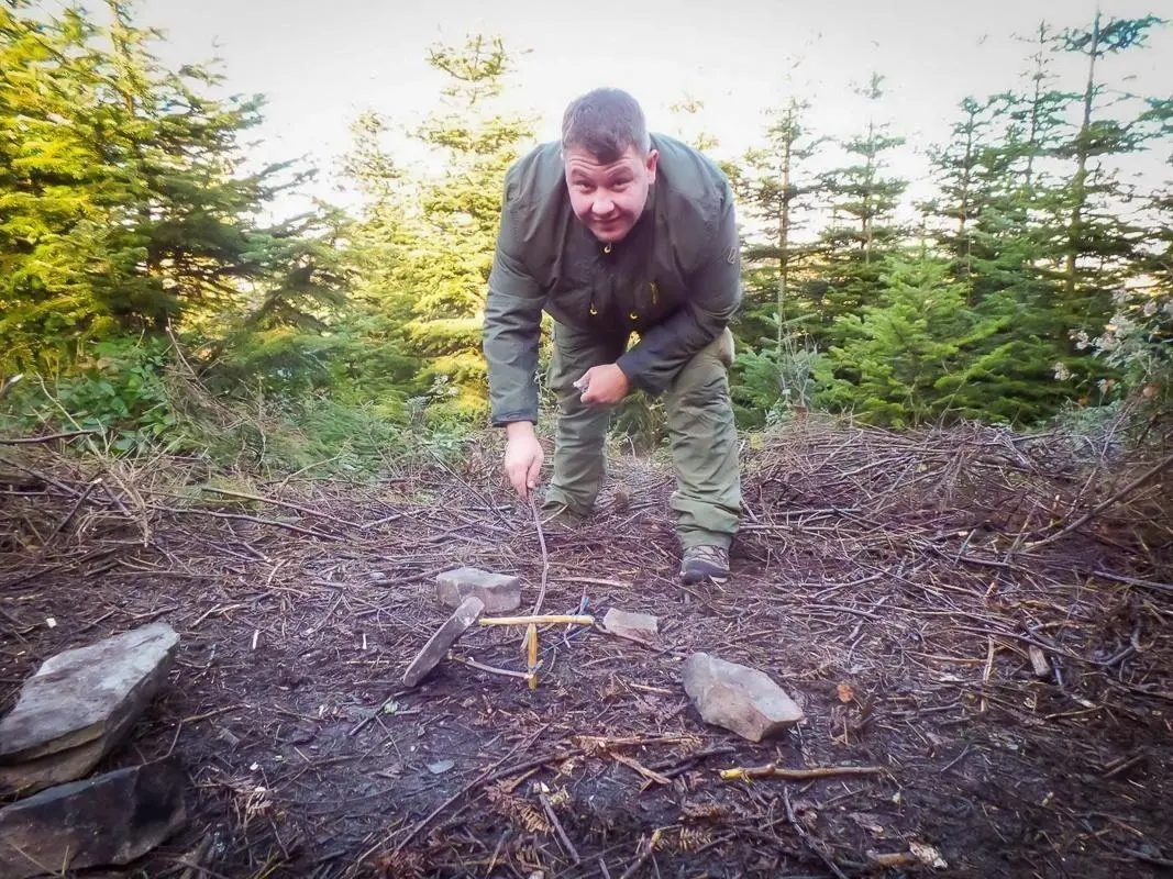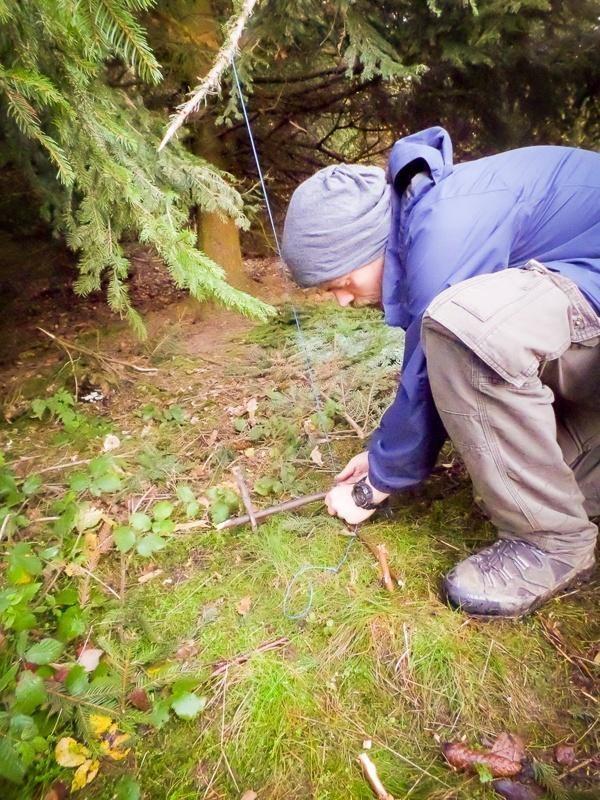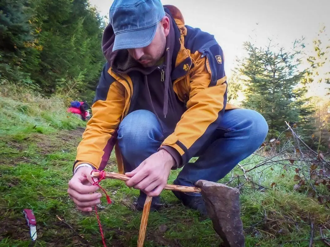 Person spannt eine Schnur an einer selbstgebauten Schlagfalle (Figure-Four) im Wald