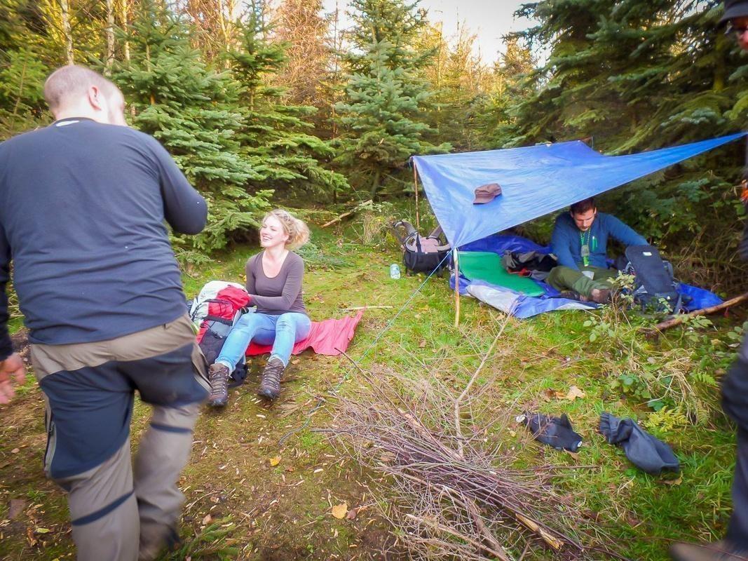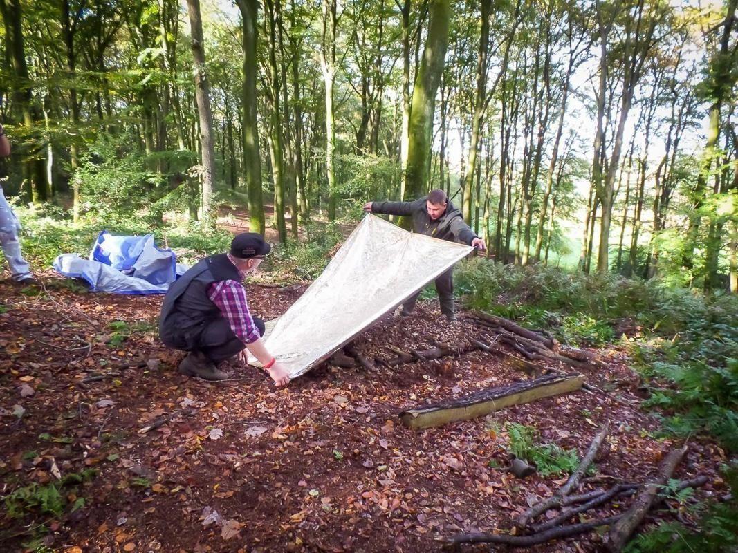 Gruppe baut Tarp-Notunterkunft im Wald auf, umgeben von Bäumen und Laub