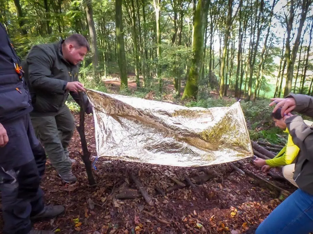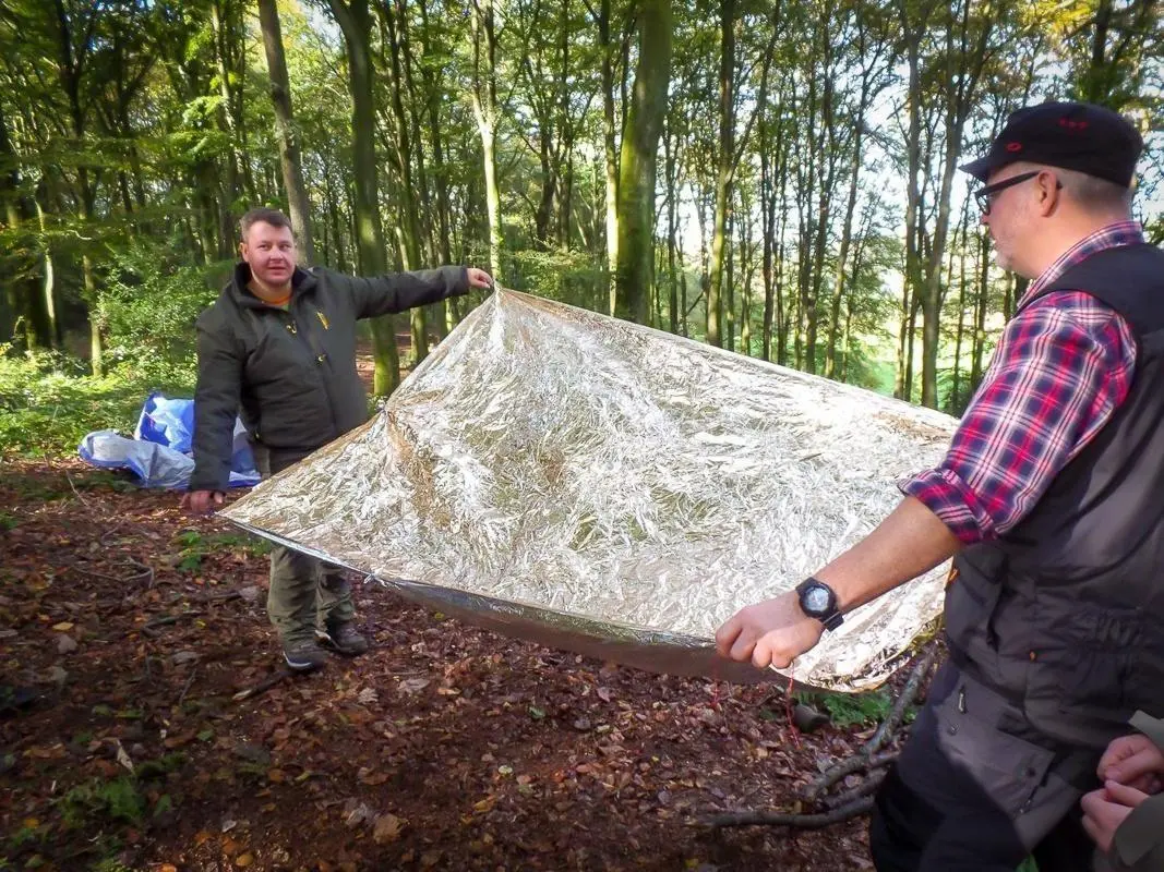 Zwei Personen halten eine reflektierende Notunterkunft aus Alufolie im Wald