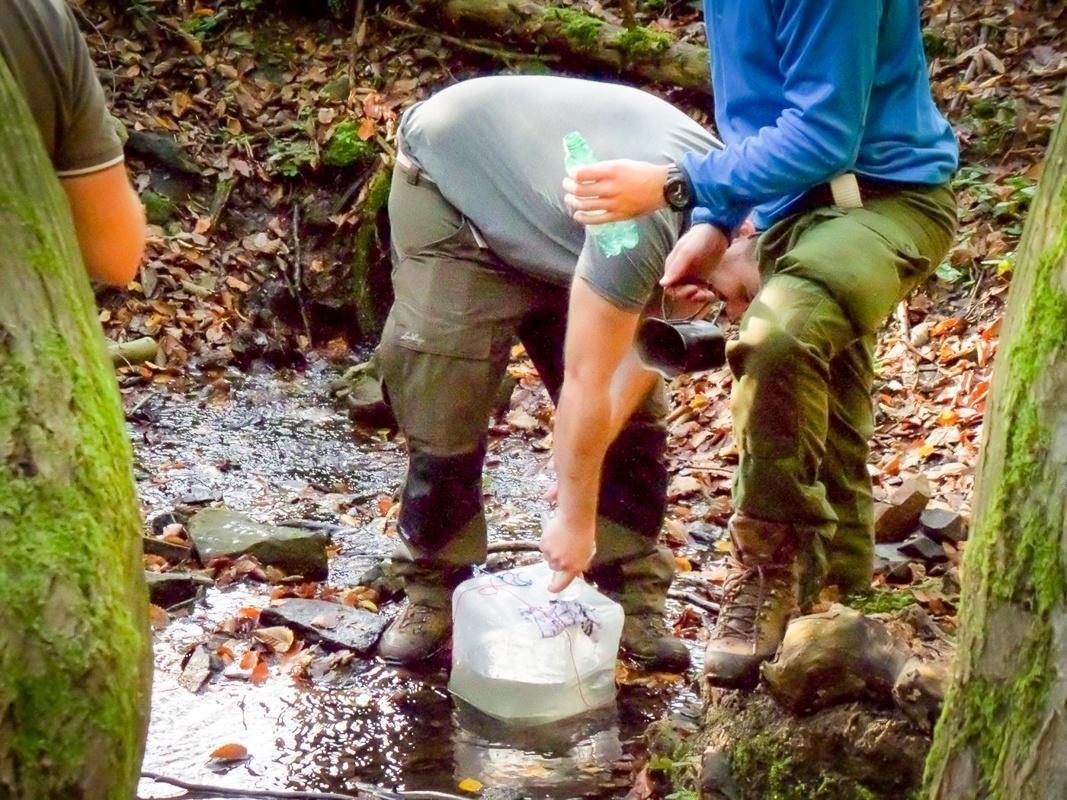 Wasser wird aus einem Bach in einen Beutel gefüllt