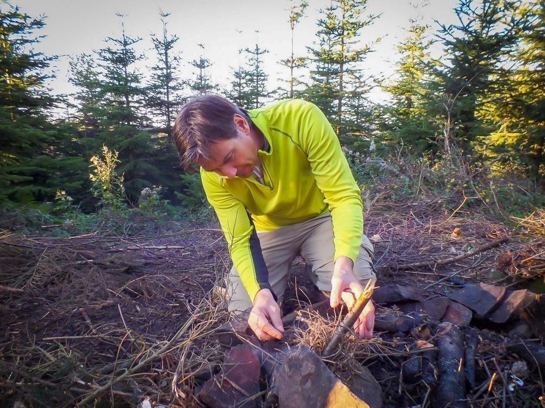 Mann kniet neben einer kleinen Flamme auf dem Boden, Holzstücke liegen verstreut