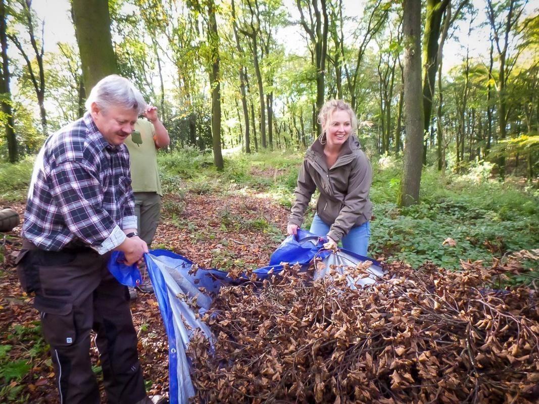 Gruppe trägt große Säcke mit Laub durch den Wald