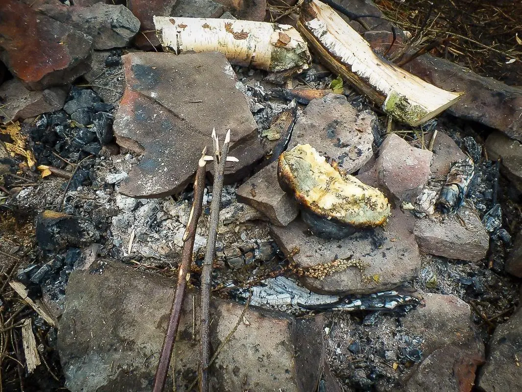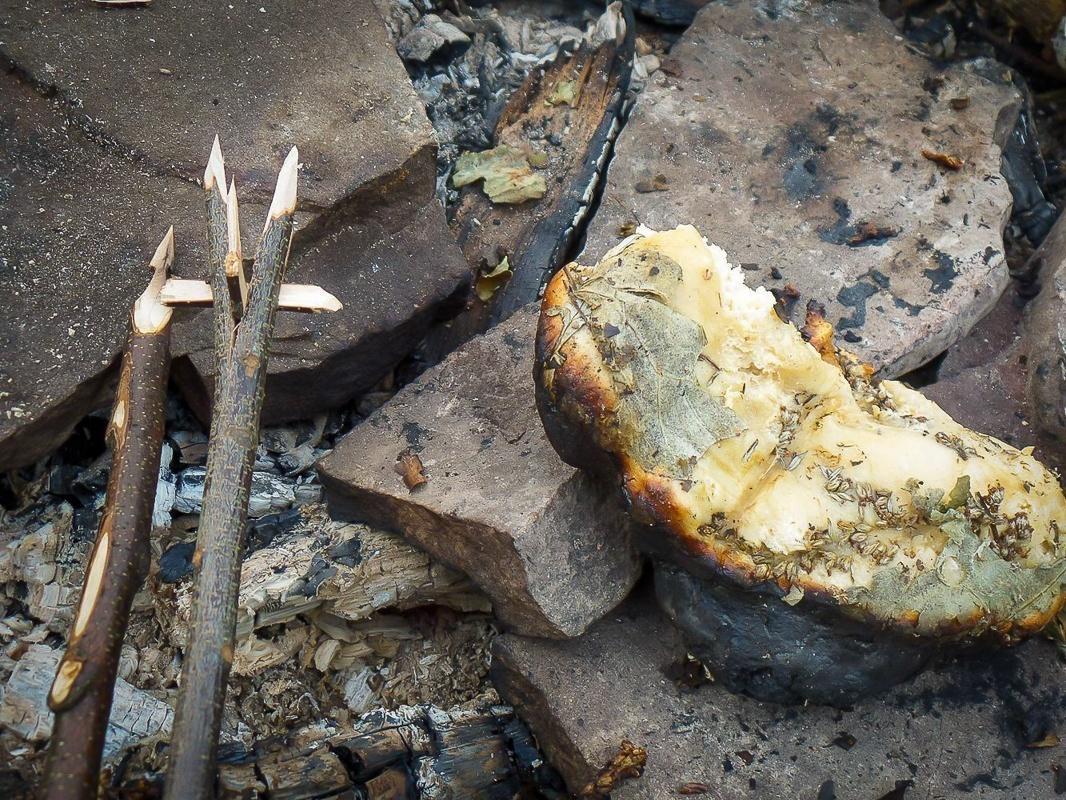 Asche und Steine umgeben von verbranntem Holz und zwei Spießen auf dem Boden