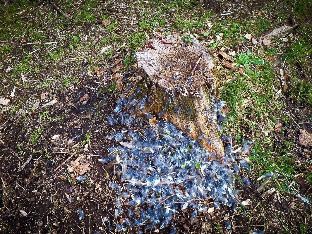 Baumstumpf mit blauen Federn und Erde umgeben, einige kleine Äste sichtbar
