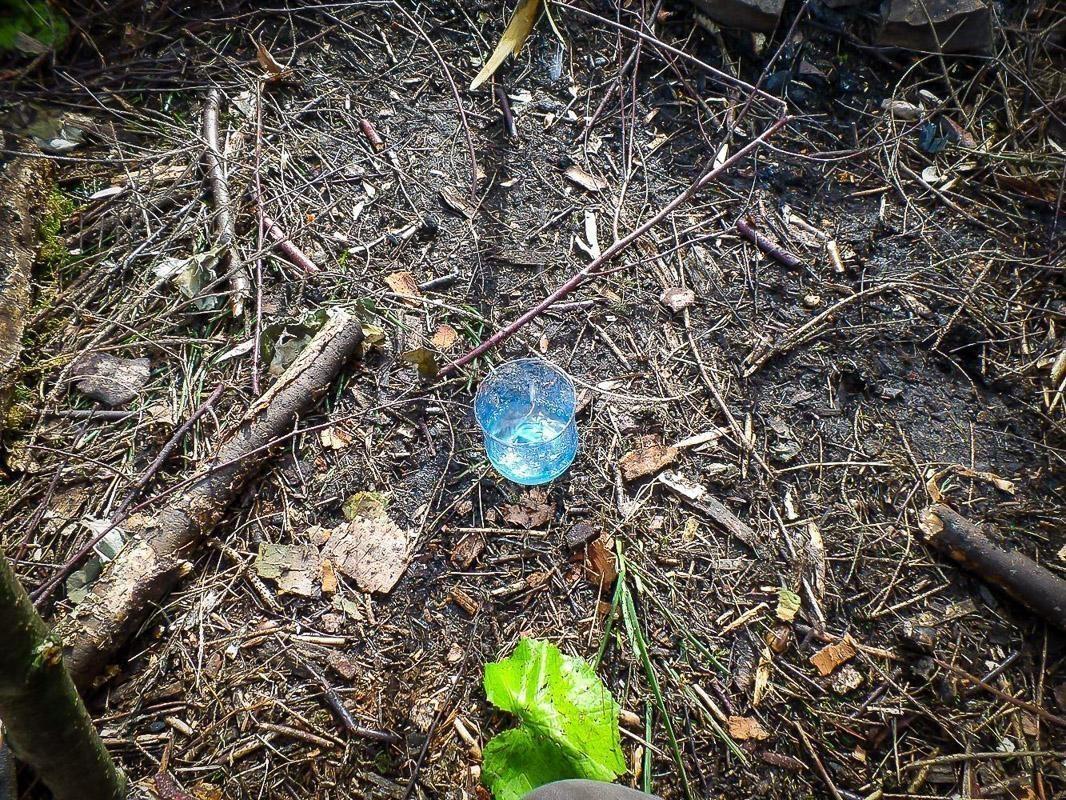 Blaues Objekt auf dem Boden zwischen Ästen und Laub