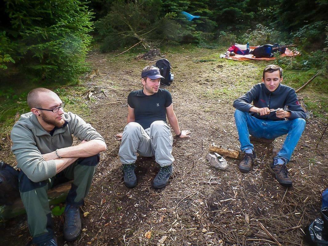 Drei Personen sitzen im Wald und sortieren Ausrüstung in schwarzen Taschen
