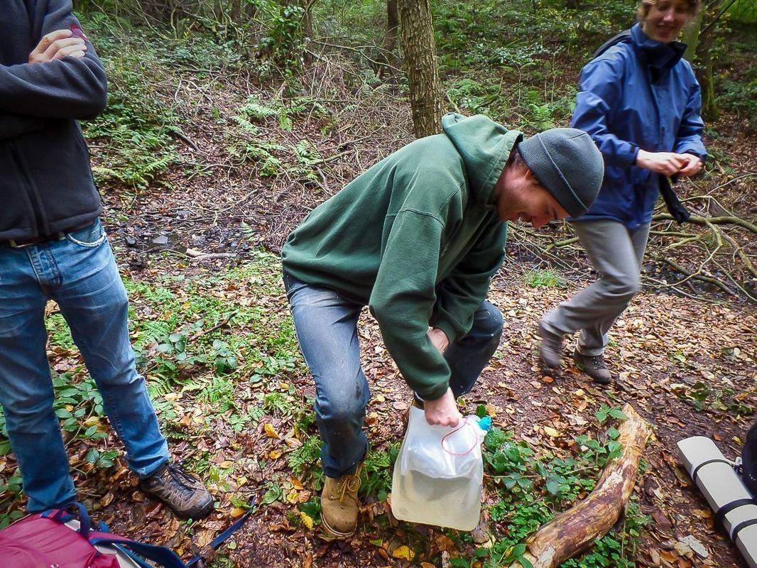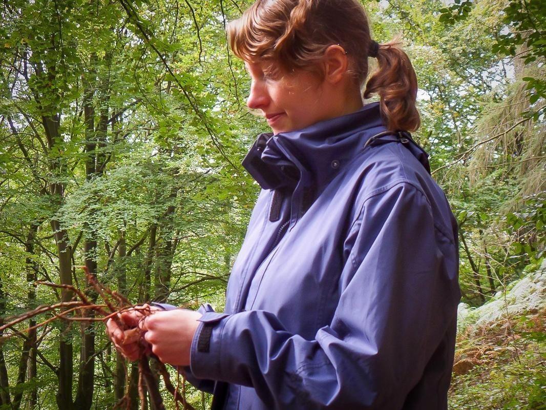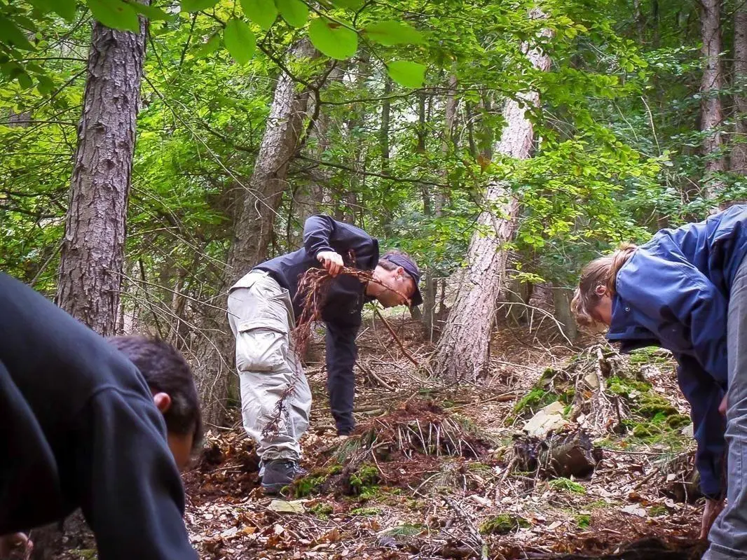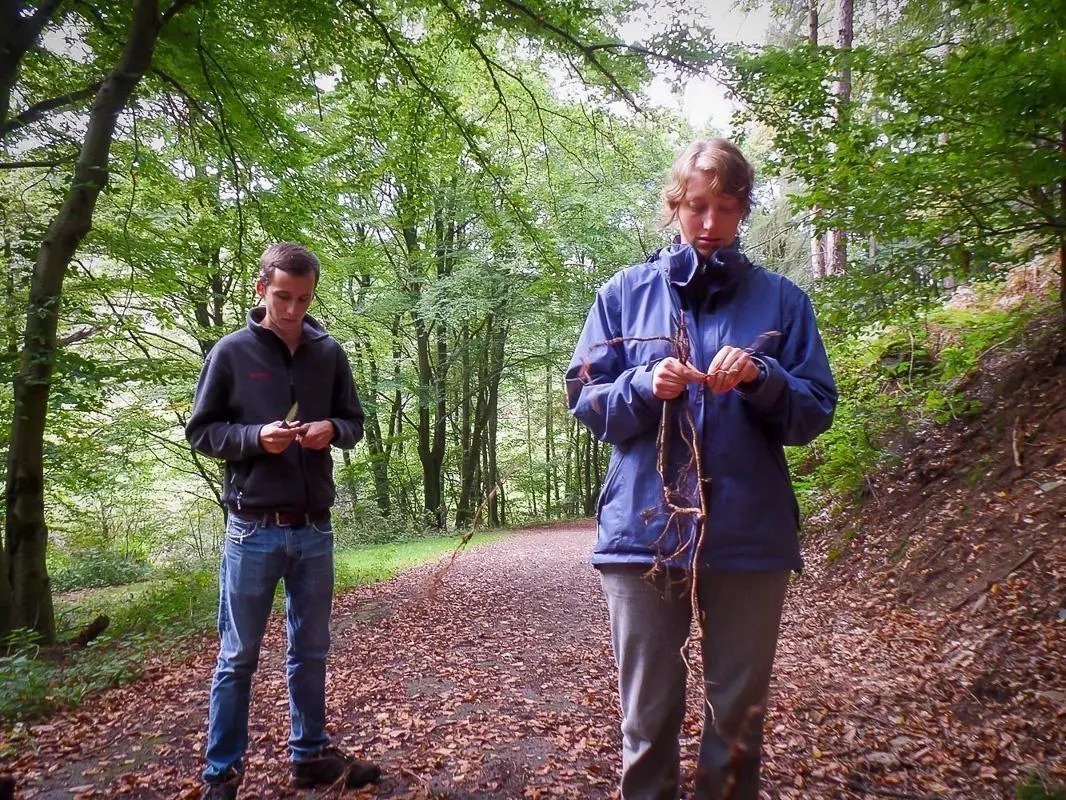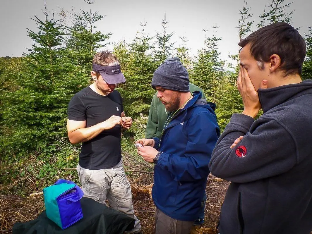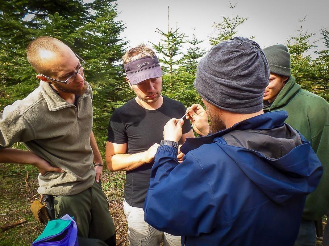 Gruppendiskussion über eine Technik im Wald, Teilnehmer betrachten ein Objekt
