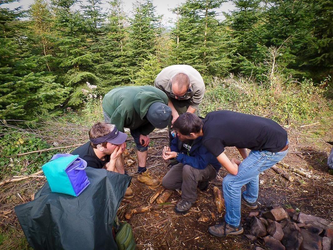 Fünf Personen beugen sich über einen kleinen Haufen Holz im Wald