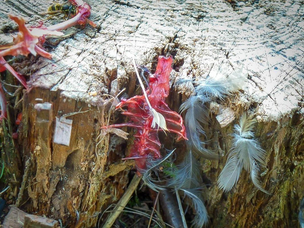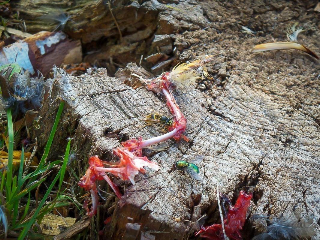 Insekten krabbeln über einen Holzstamm mit Fleischresten und Federn