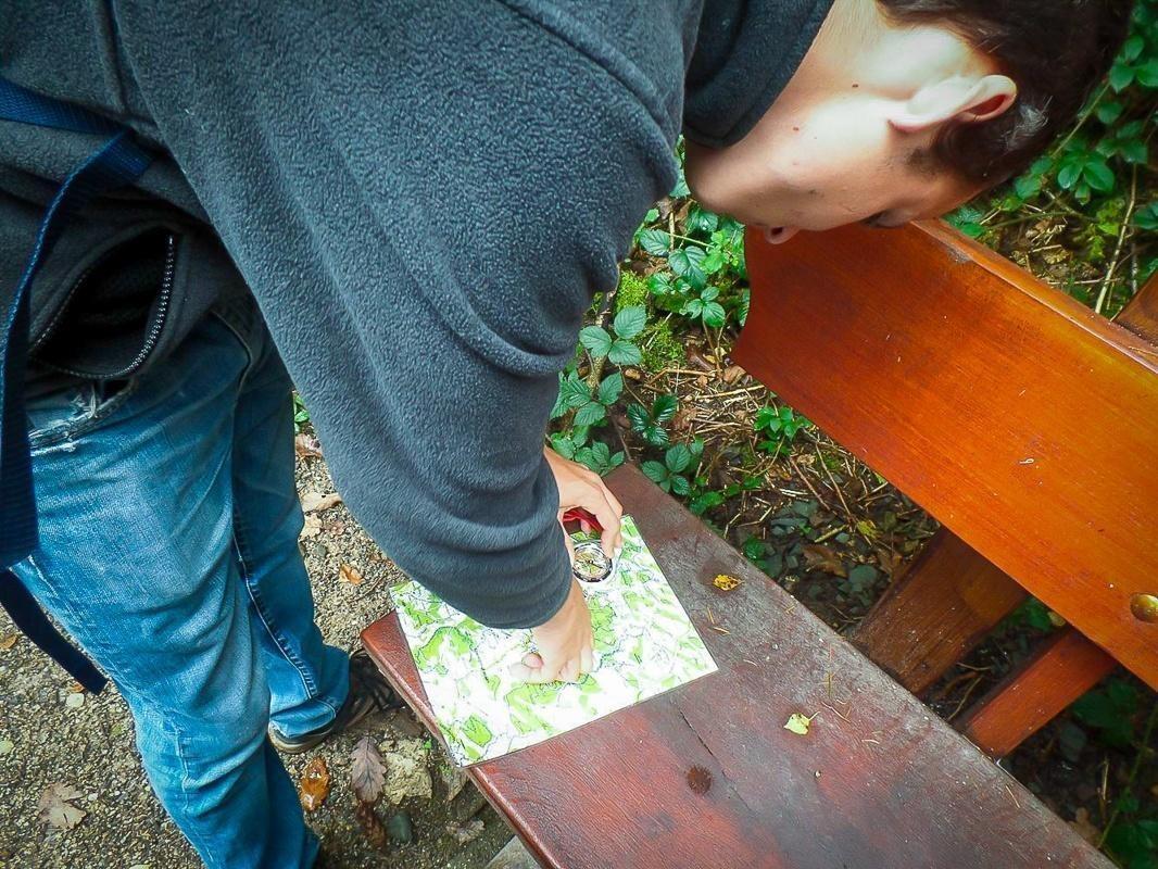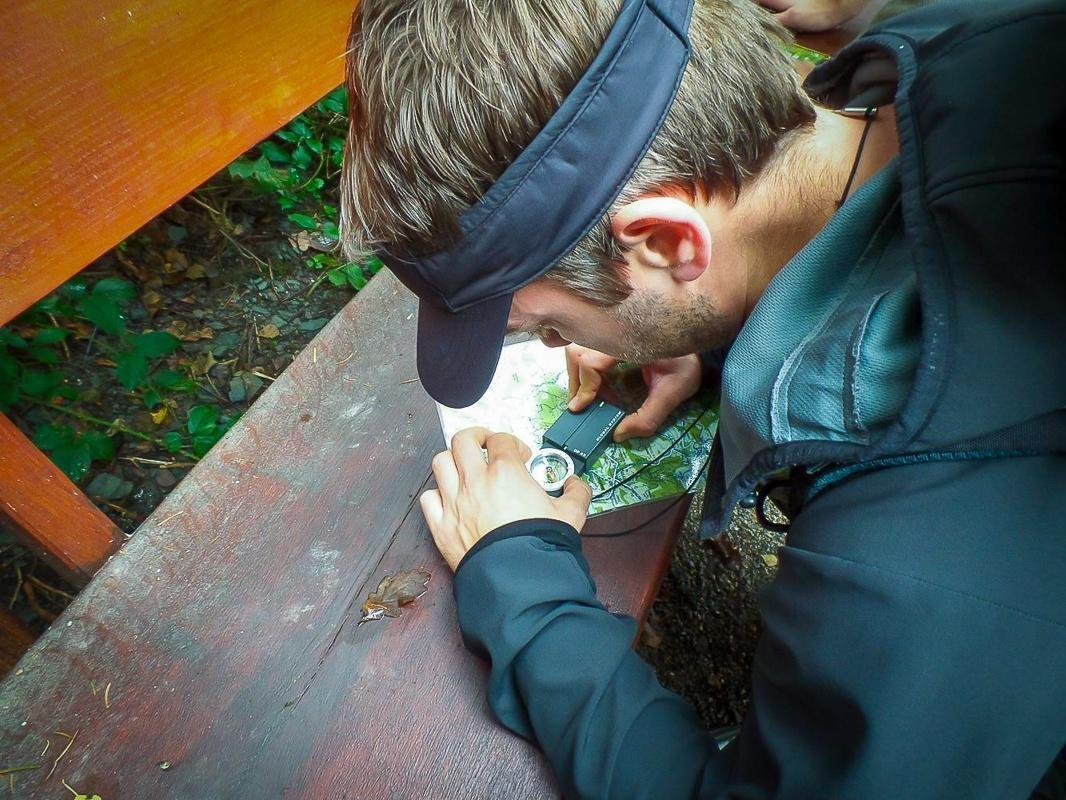 Karte liegt auf einer Bank, Kompass wird darauf ausgerichtet