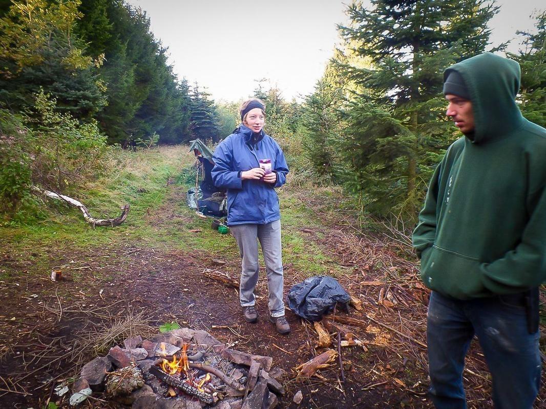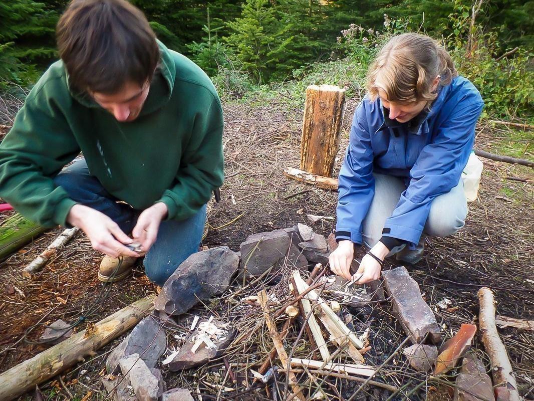 Zwei Personen stehen in einem Waldgebiet neben einem Steinhaufen für ein Feuer