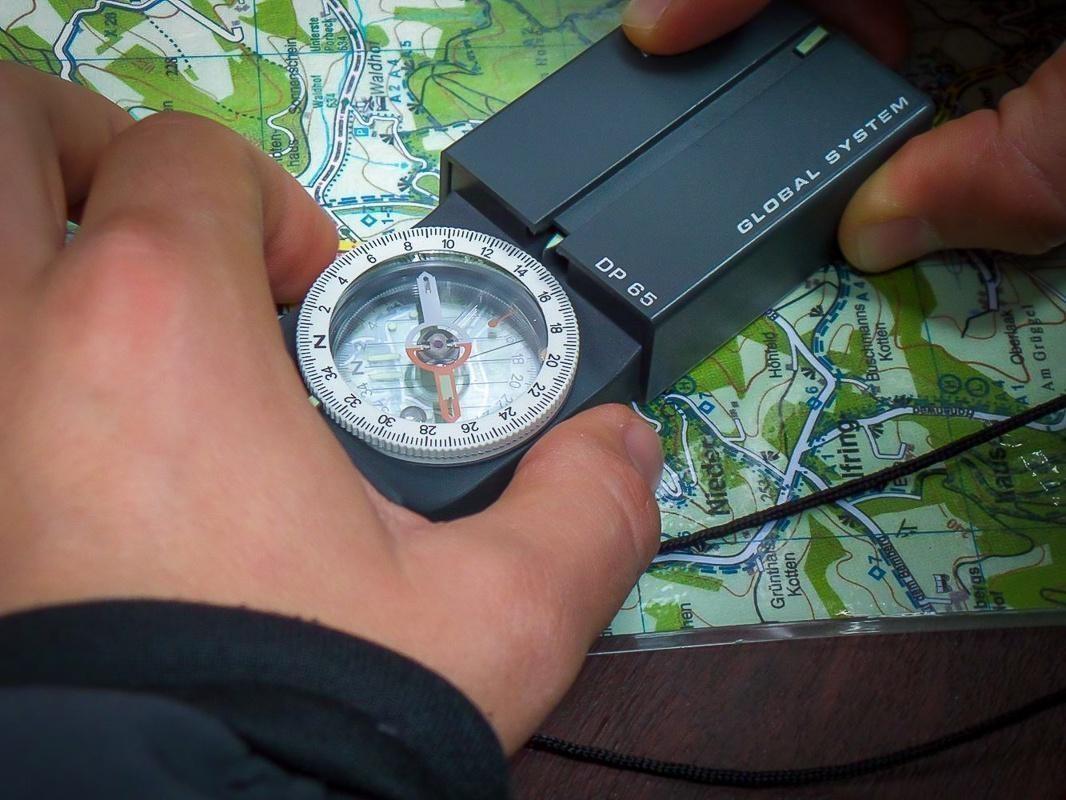 Kompass wird auf einer Karte ausgerichtet, um die Richtung zu bestimmen