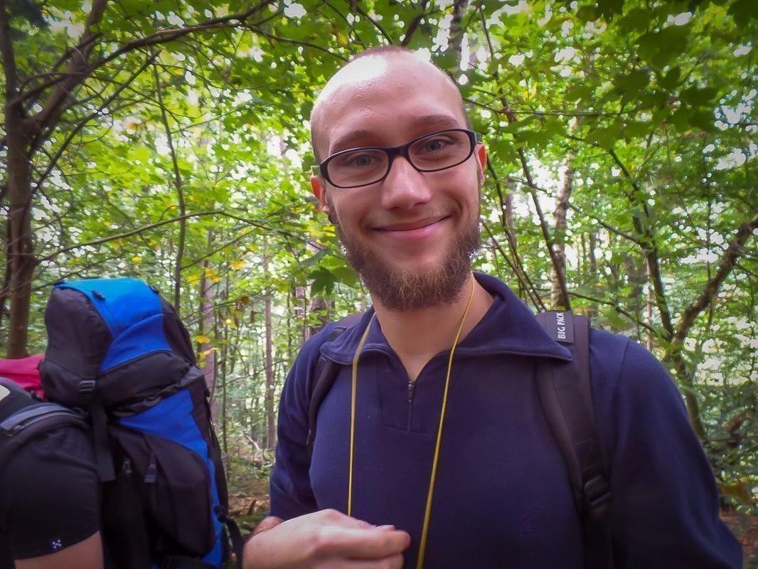 Lächelnder Mann mit Rucksack in einem Waldgebiet