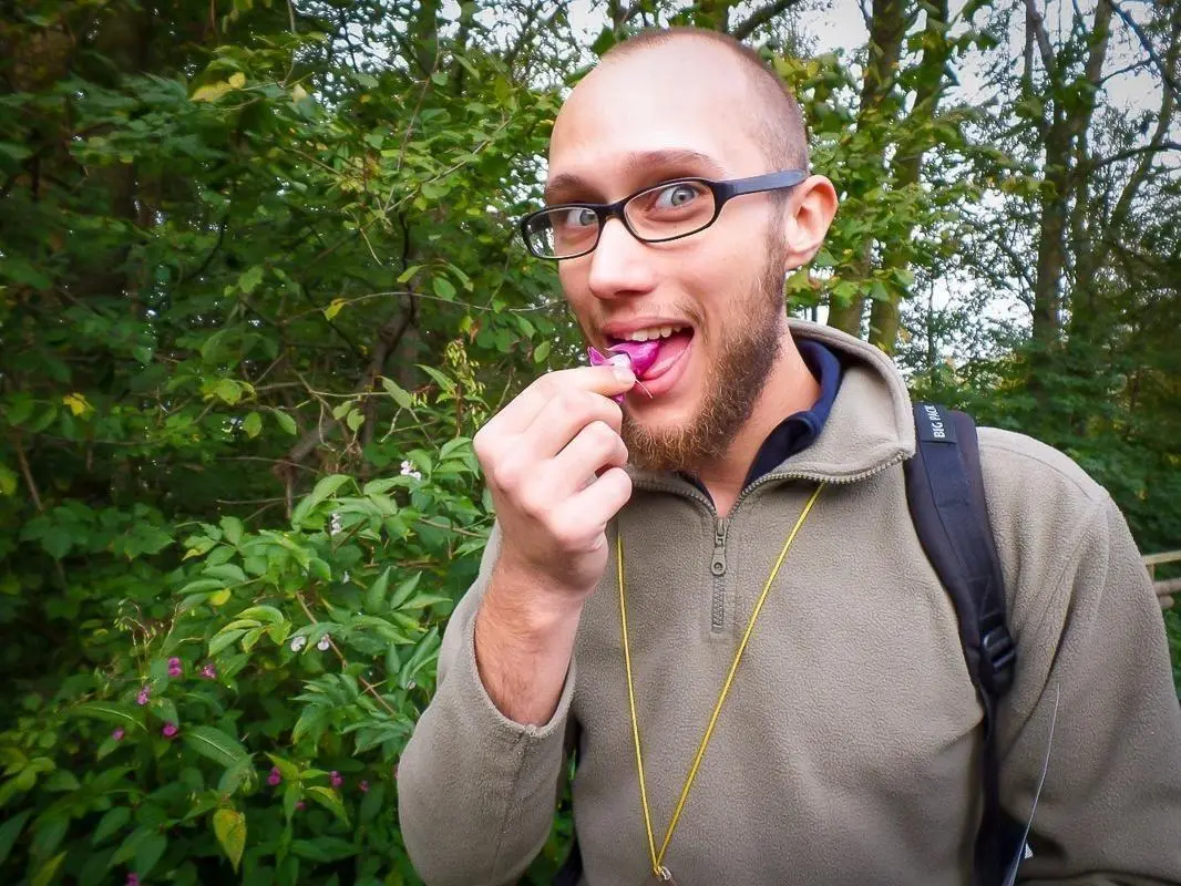 Mann hält eine Blüte vor den Mund und lächelt, im Hintergrund grüne Pflanzen