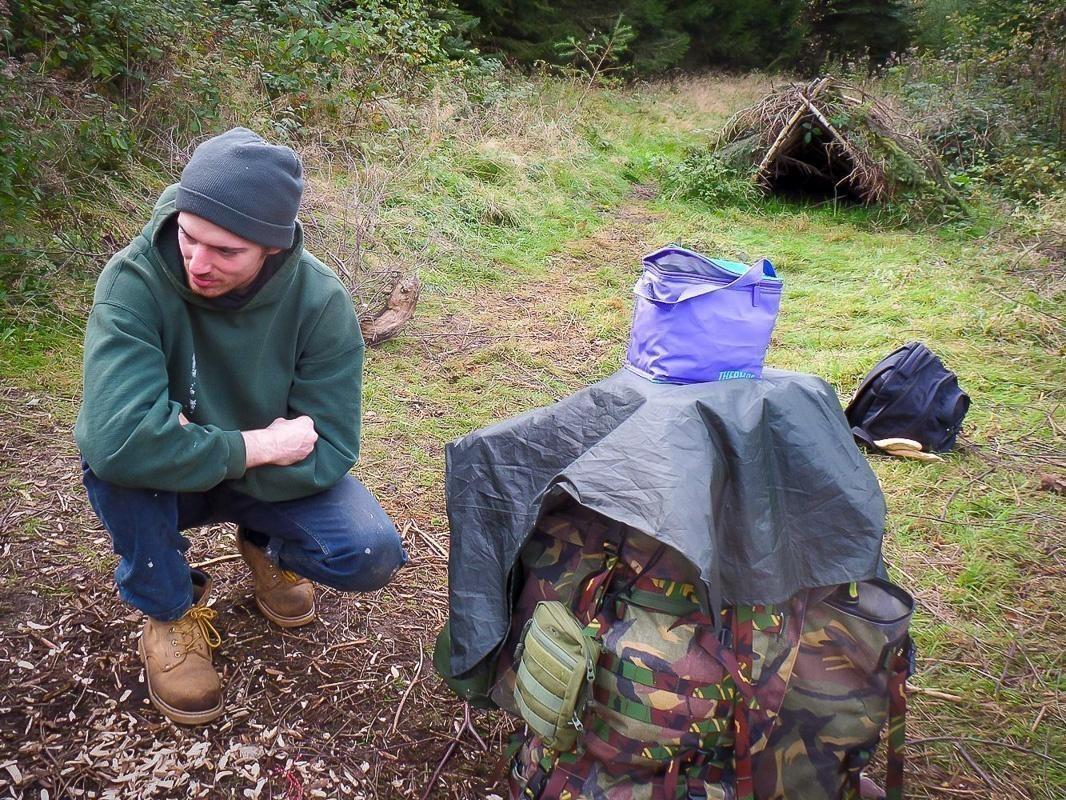 Mann kniet neben einem Rucksack, der mit einer Plane abgedeckt ist