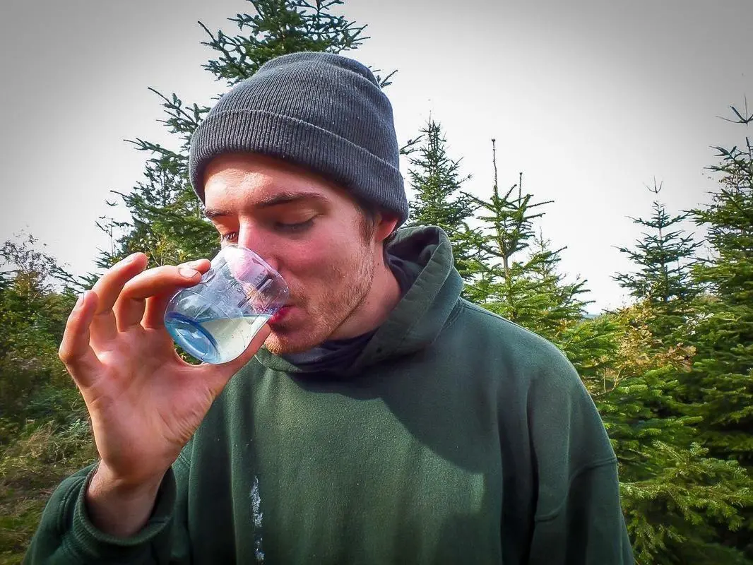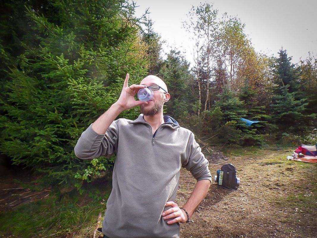 Mann trinkt aus einem Becher in einem Waldgebiet