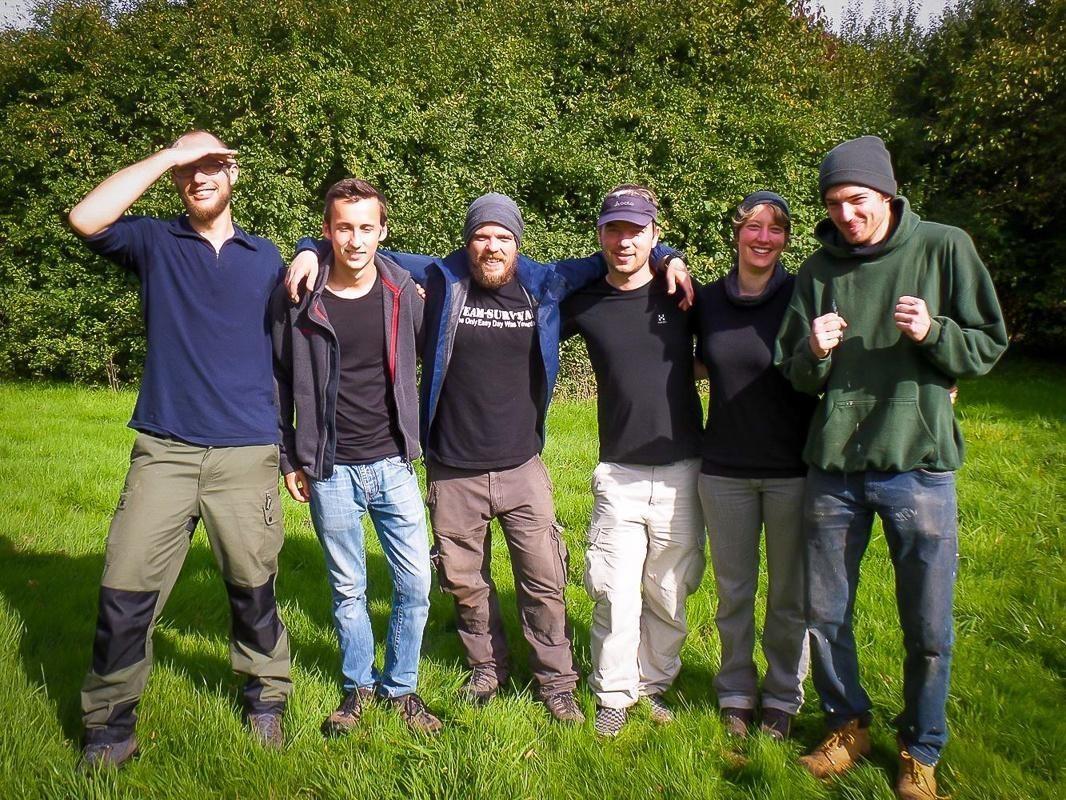 Sechs Personen stehen auf einer Wiese und lächeln in die Kamera