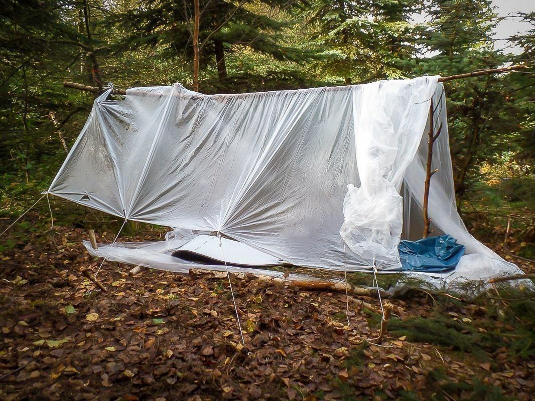 Tarp-Notunterkunft aus Folie, auf Ästen gespannt, im Wald auf Laubboden