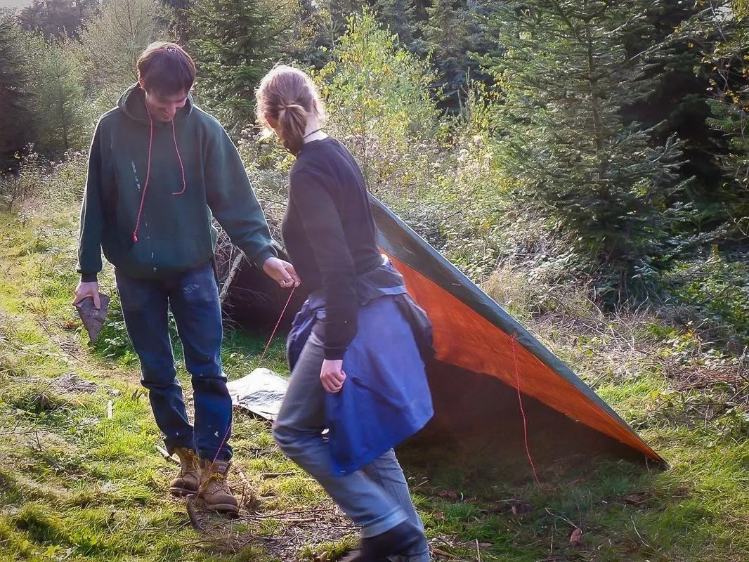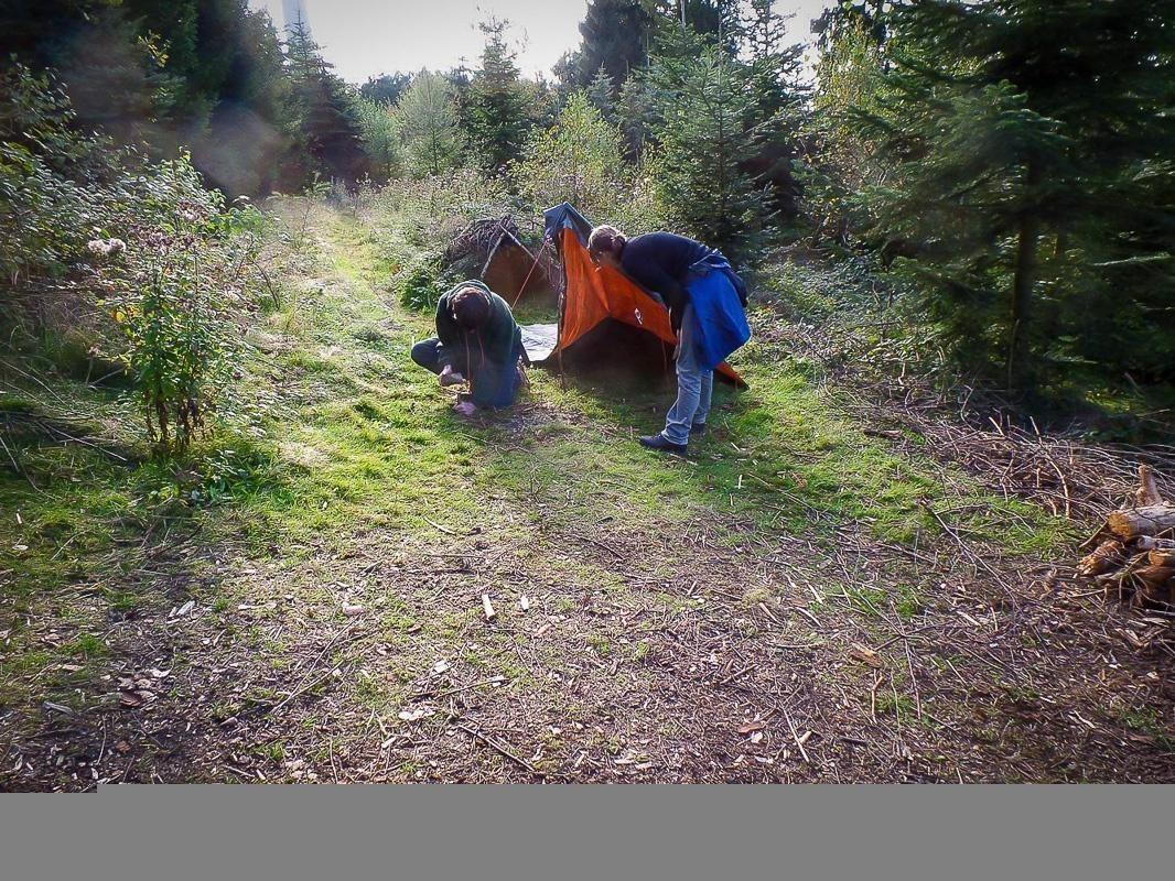 Zwei Personen bauen eine Tarp-Notunterkunft im Wald auf