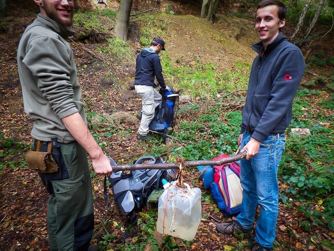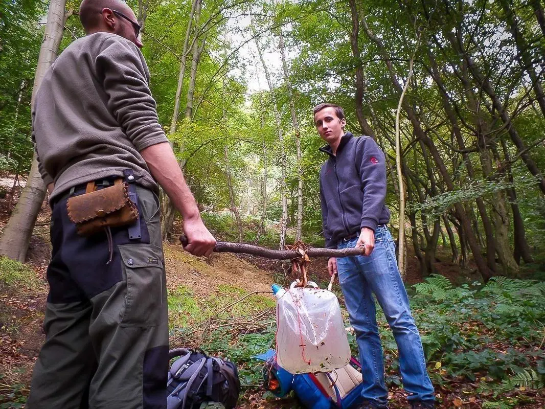 Zwei Personen halten einen Stock mit einem Behälter, während eine dritte Person Rucksäcke organisiert