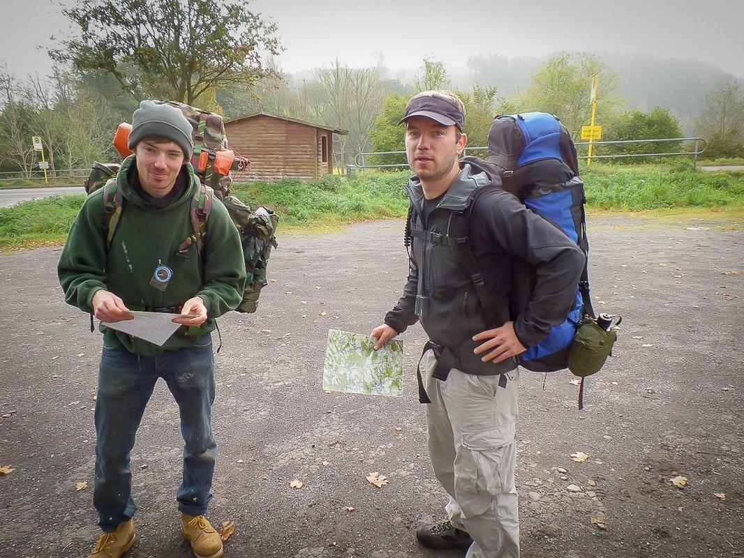 Zwei Personen mit Rucksäcken studieren Kartenmaterial auf einem Parkplatz