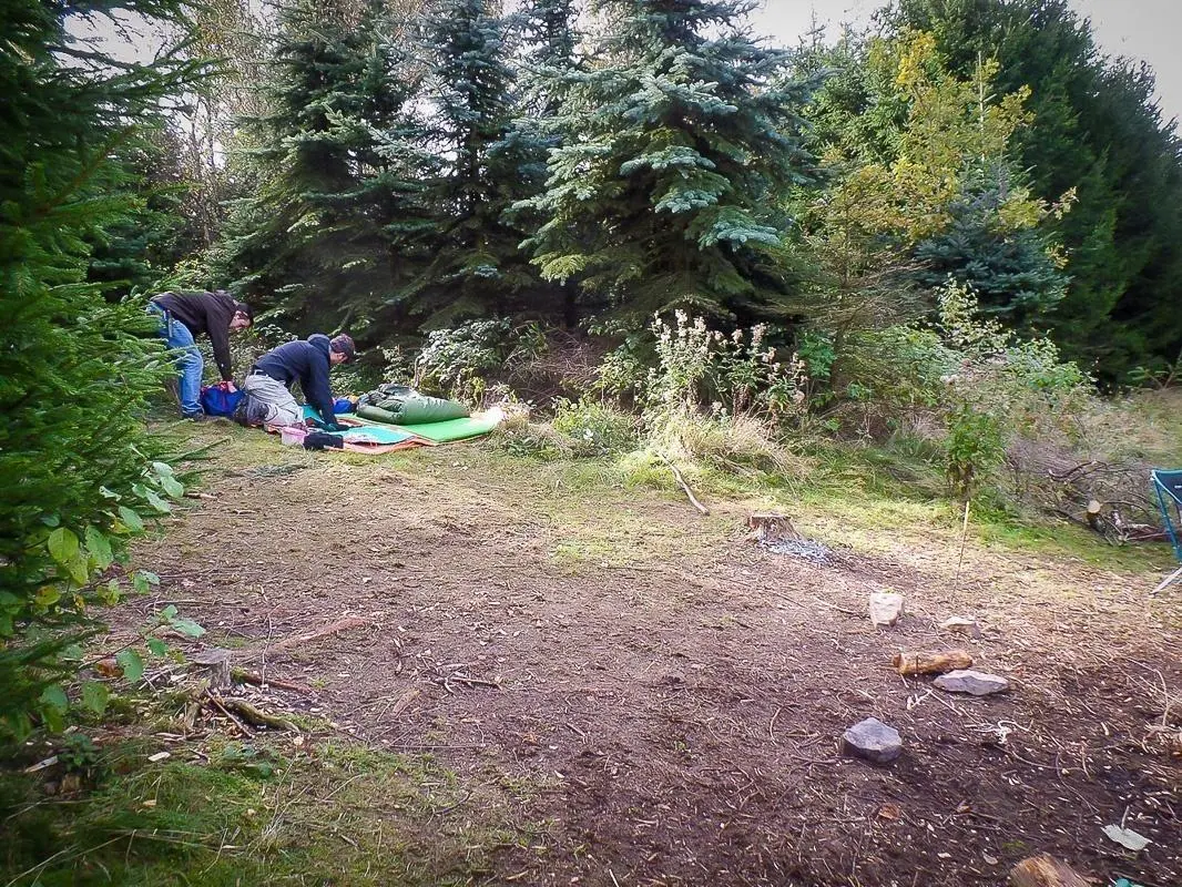 Zwei Personen bereiten eine Schlafunterlage im Wald vor