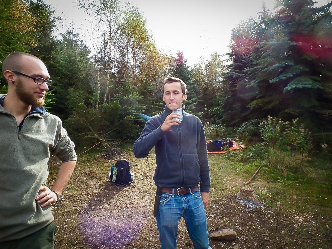 Zwei Personen stehen in einem Waldgebiet, eine hält eine Dose in der Hand