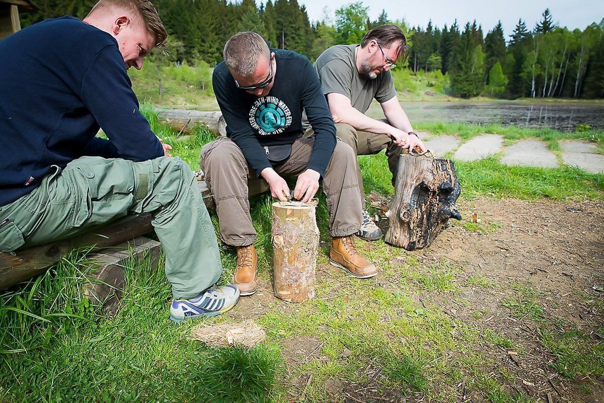 Messer bearbeitet Holzstück auf einem Baumstumpf, zwei Personen beobachten