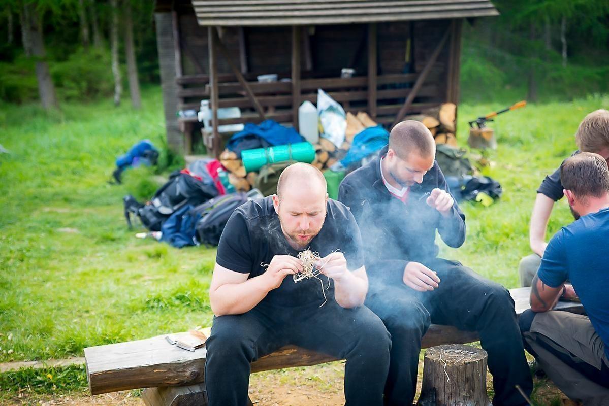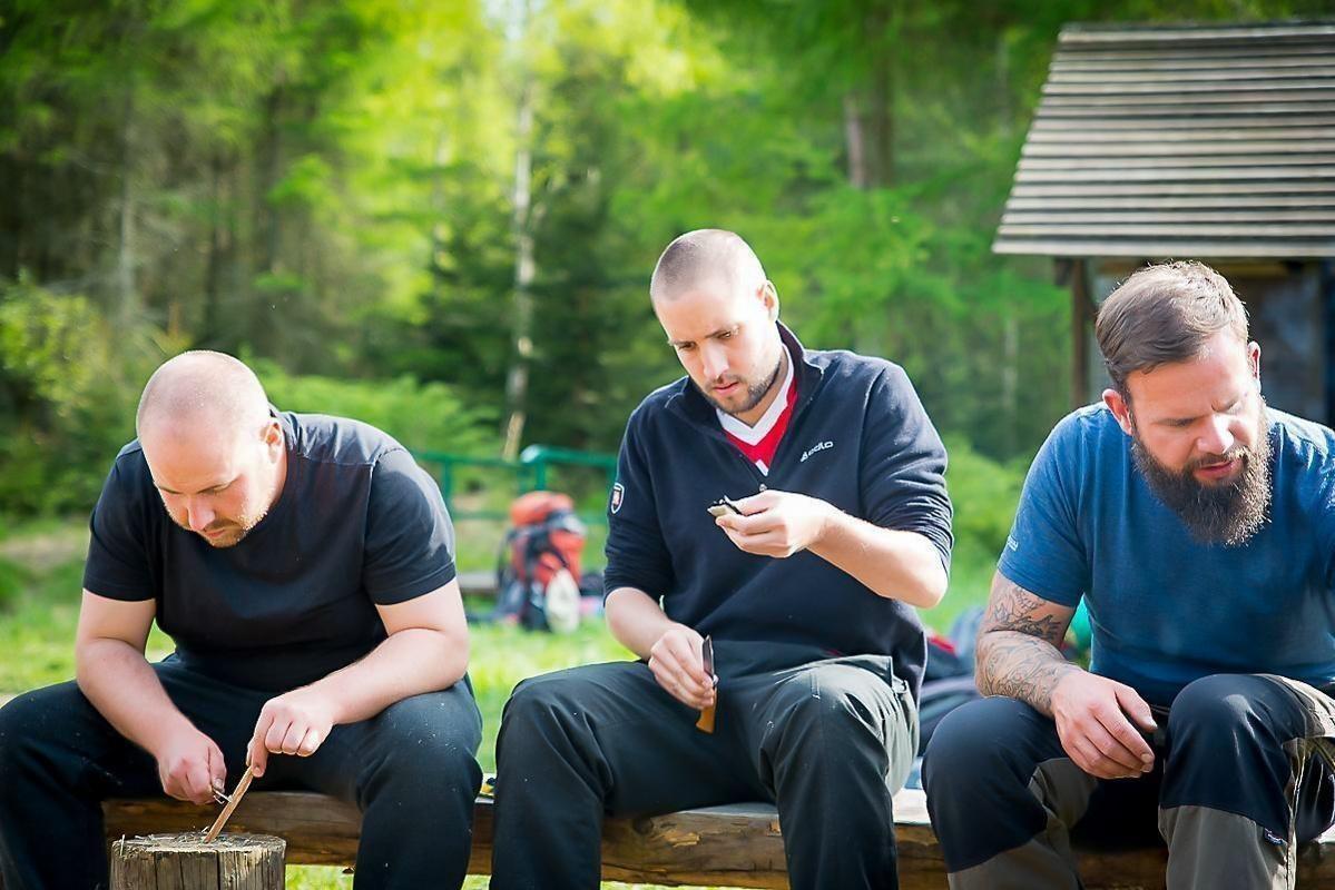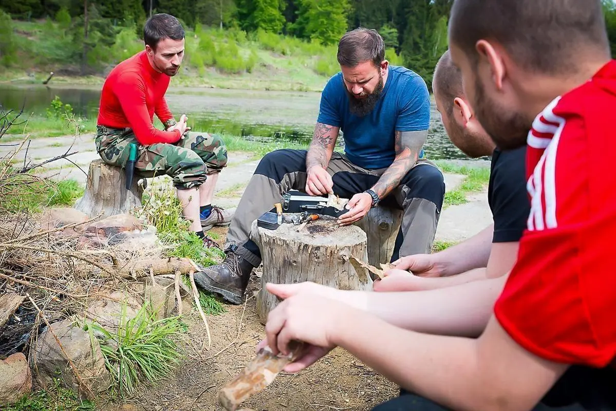Ein weiterer wichtiger Bestandteil des Trainings war das sichere Arbeiten mit dem Messer, insbesondere beim Schnitzen. Die Teilnehmer lernten, wie sie Holzstücke bearbeiten können, um nützliche Werkzeuge und Unterstände herzustellen. Diese Fähigkeiten wurden in praktischen Übungen vertieft, bei denen die Teilnehmer unter Anleitung Techniken zur sicheren Handhabung von Messern erprobten. Durch das gemeinsame Arbeiten an Holzstücken konnten sie nicht nur ihre Fertigkeiten verbessern, sondern auch Teamarbeit und Kommunikation stärken.