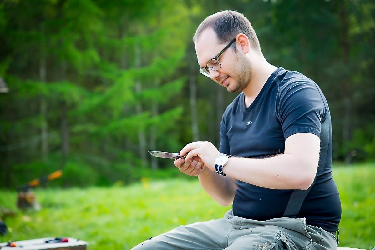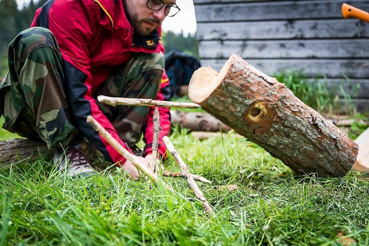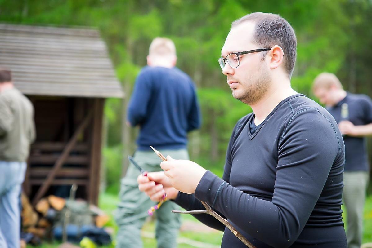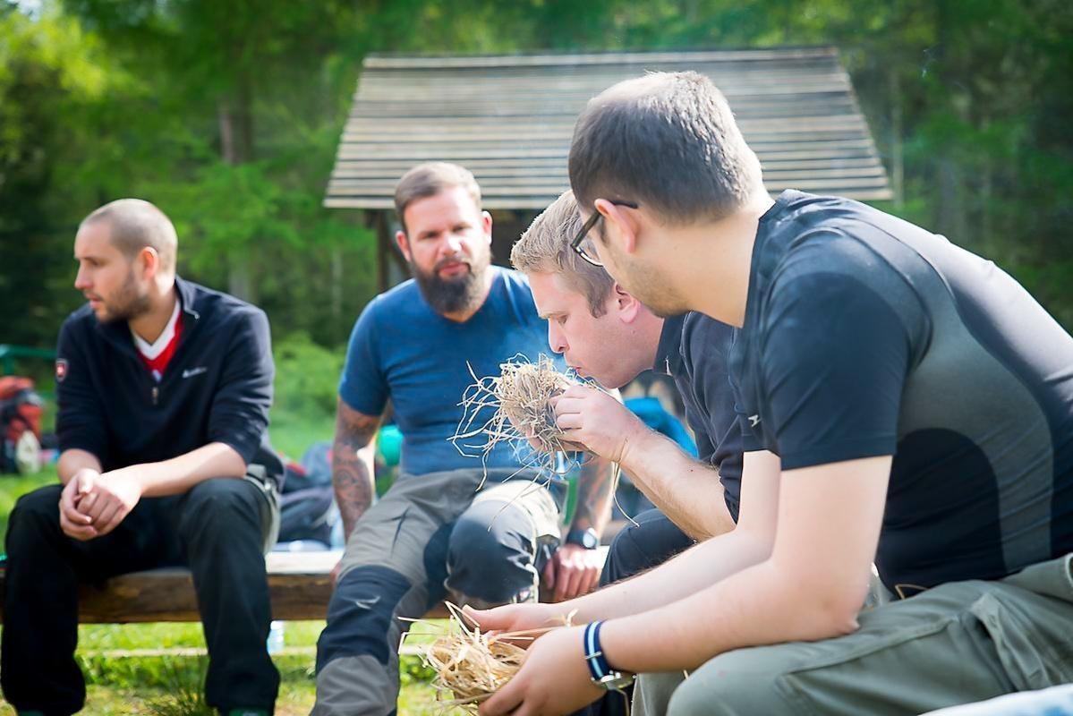 Ein weiterer wichtiger Bestandteil des Trainings war das sichere Arbeiten mit dem Messer, insbesondere beim Schnitzen. Die Teilnehmer lernten, wie sie Holzstücke bearbeiten können, um nützliche Werkzeuge und Unterstände herzustellen. Diese Fähigkeiten wurden in praktischen Übungen vertieft, bei denen die Teilnehmer unter Anleitung Techniken zur sicheren Handhabung von Messern erprobten. Durch das gemeinsame Arbeiten an Holzstücken konnten sie nicht nur ihre Fertigkeiten verbessern, sondern auch Teamarbeit und Kommunikation stärken.
