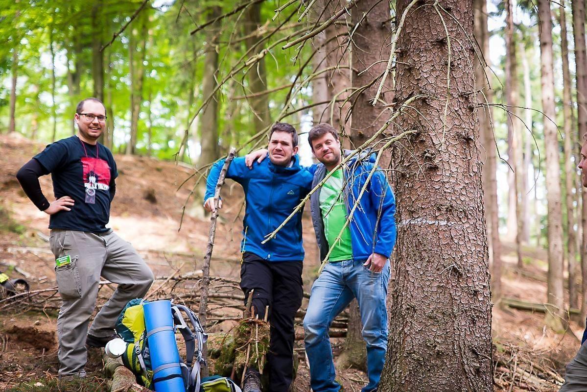 Drei Personen stehen neben einem Baum im Wald, Ausrüstung liegt am Boden