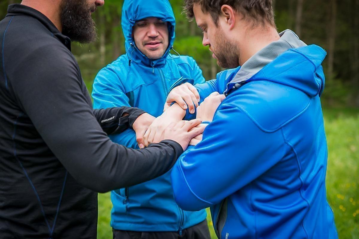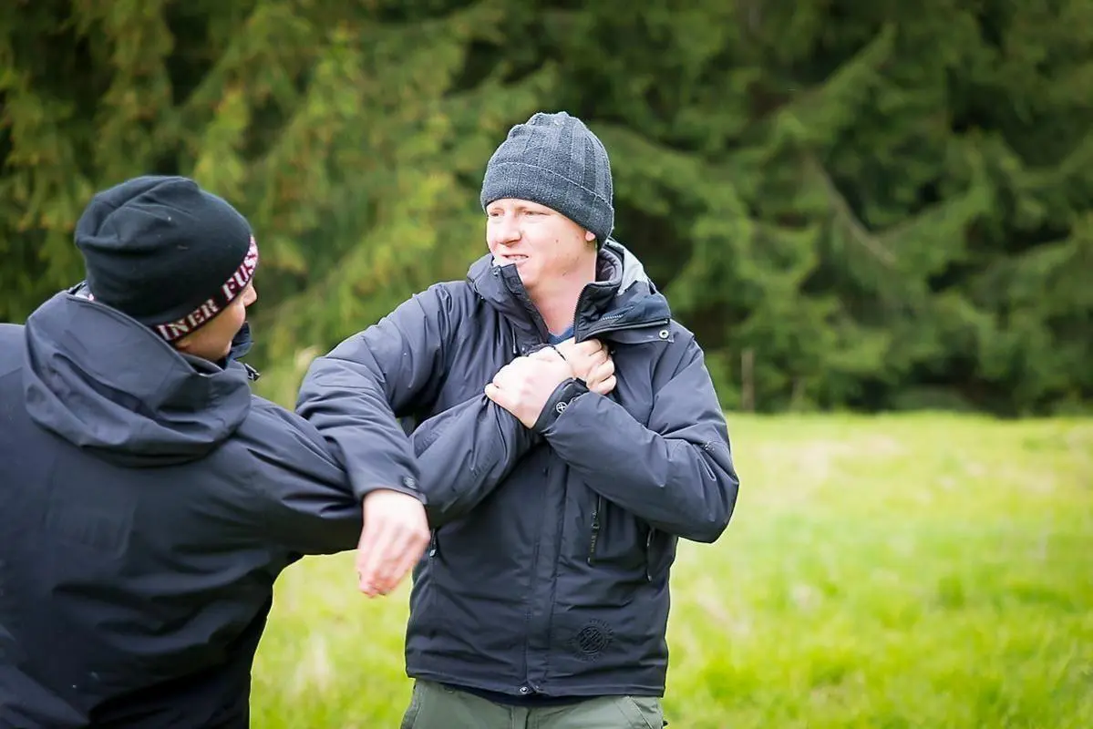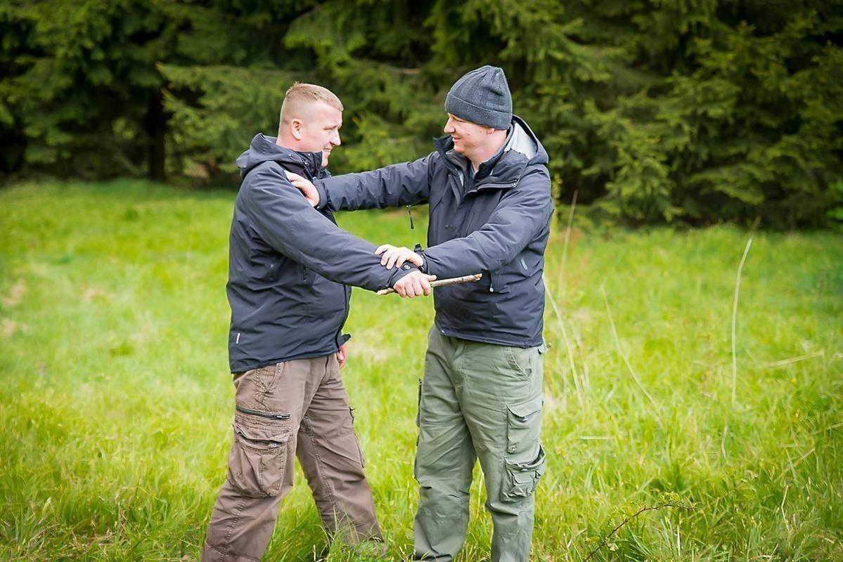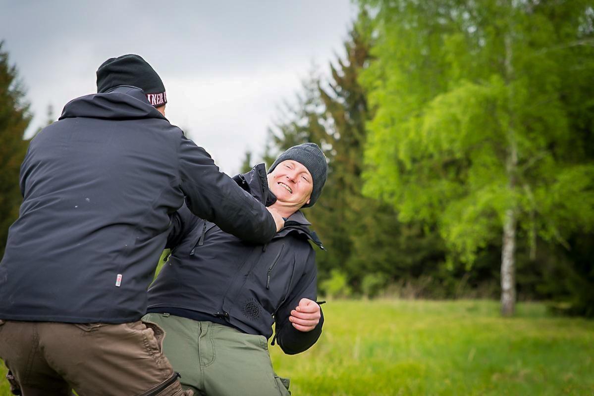 Zwei Personen in Outdoor-Bekleidung üben eine Selbstverteidigungstechnik im Freien
