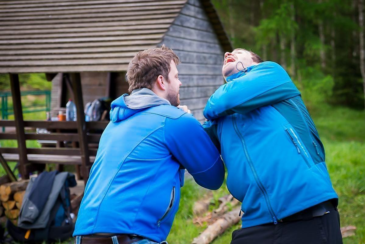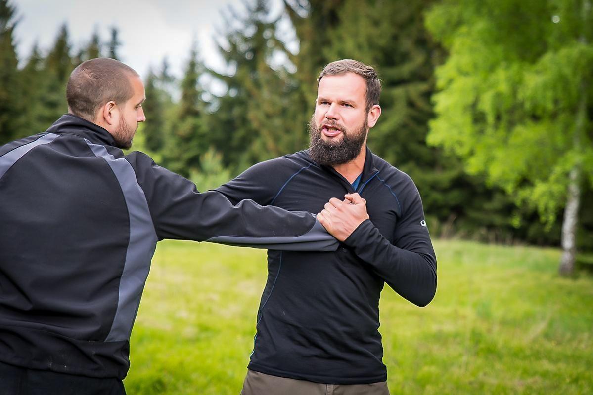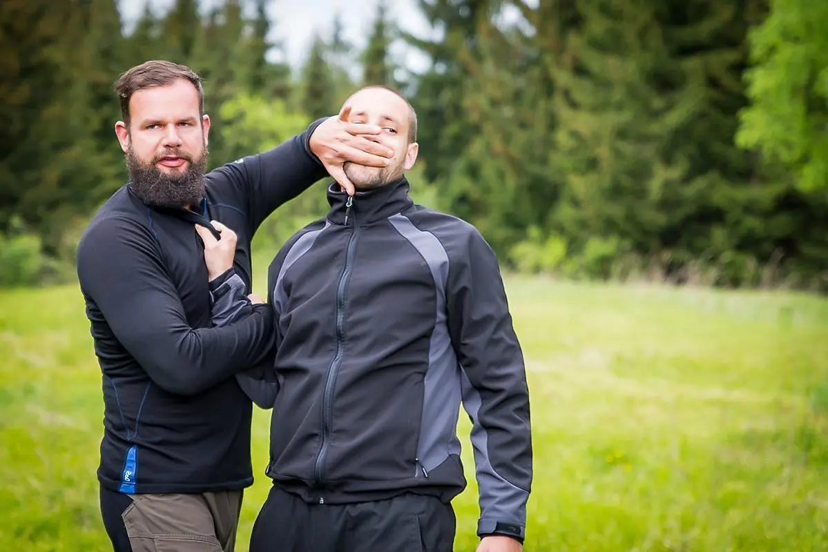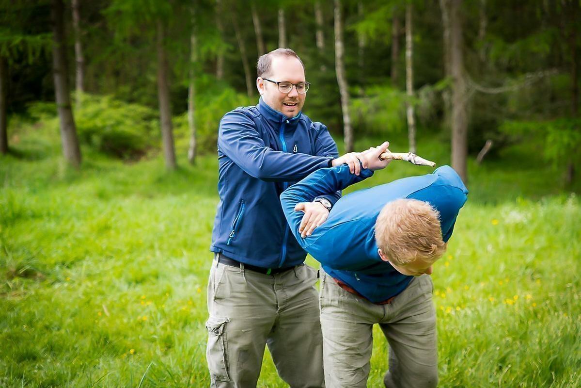 Zwei Personen in Outdoor-Bekleidung üben eine Selbstverteidigungstechnik im Freien