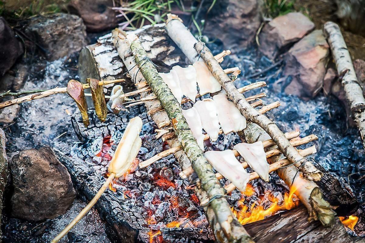 Fischstücke werden über einem offenen Feuer auf Holzstäben gegart