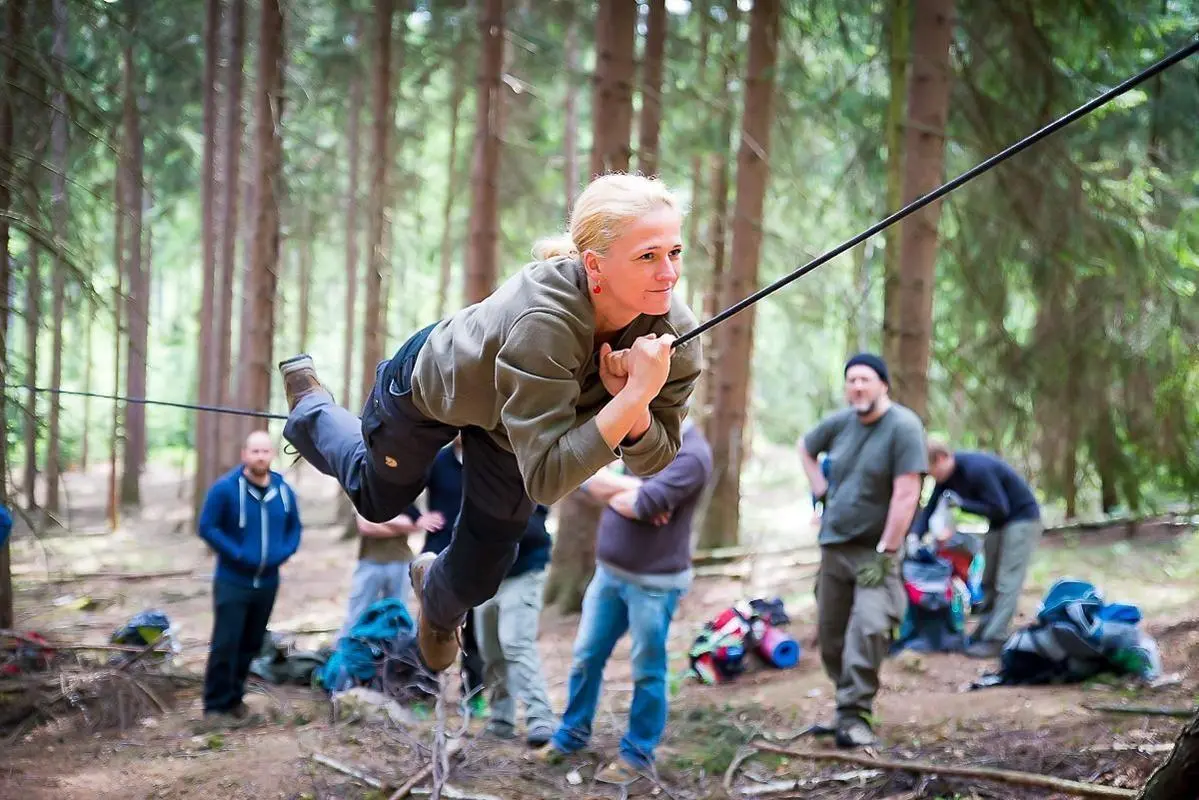 Frau überquert selbstgebaute Seilbrücke im Wald, Zuschauer im Hintergrund