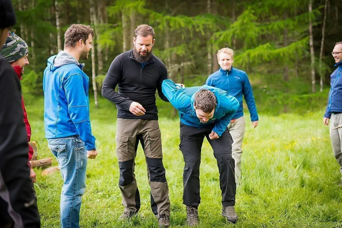 Gruppendynamik im Freien, Teilnehmer üben körperliche Interaktion auf einer Wiese