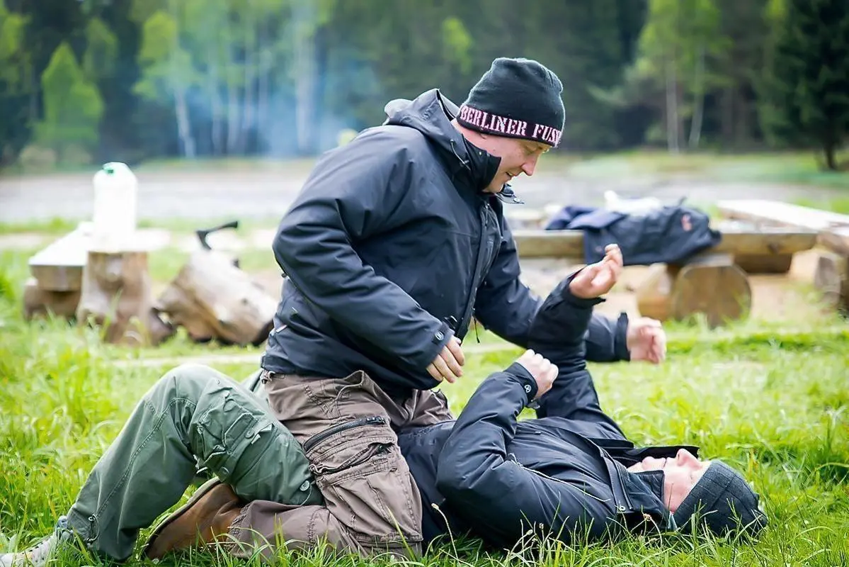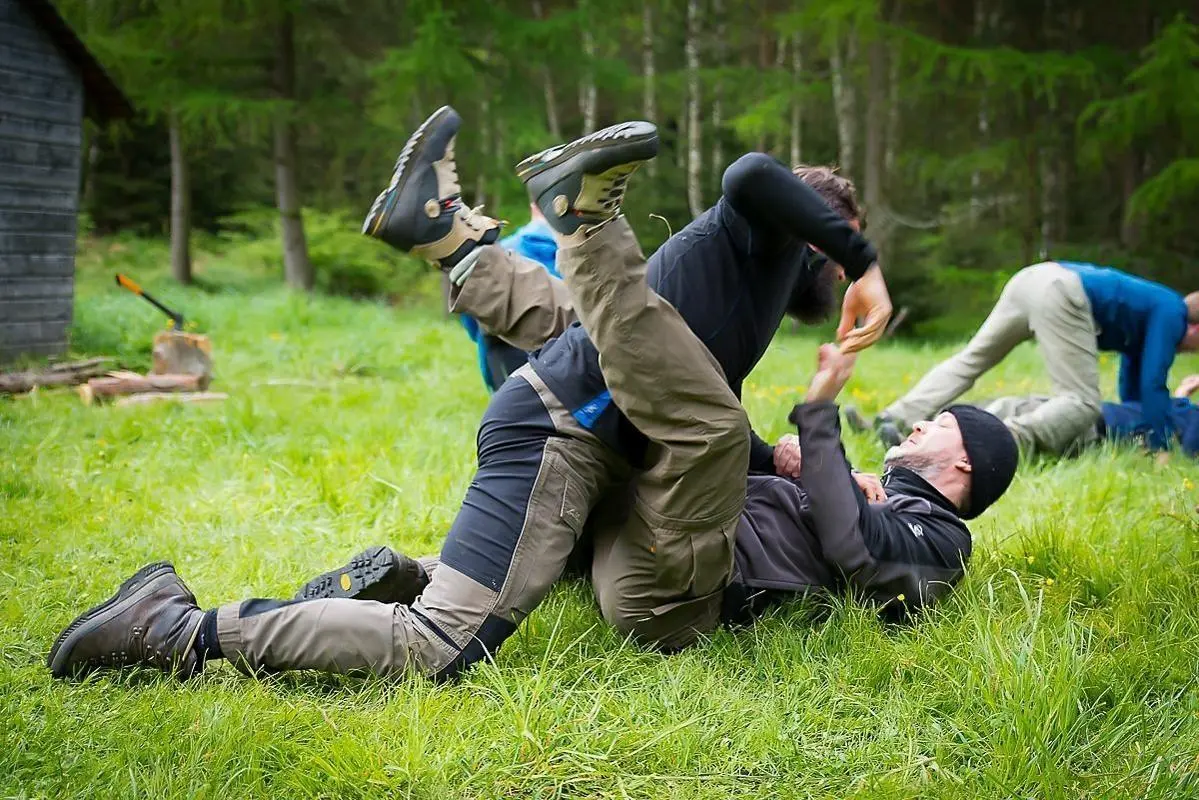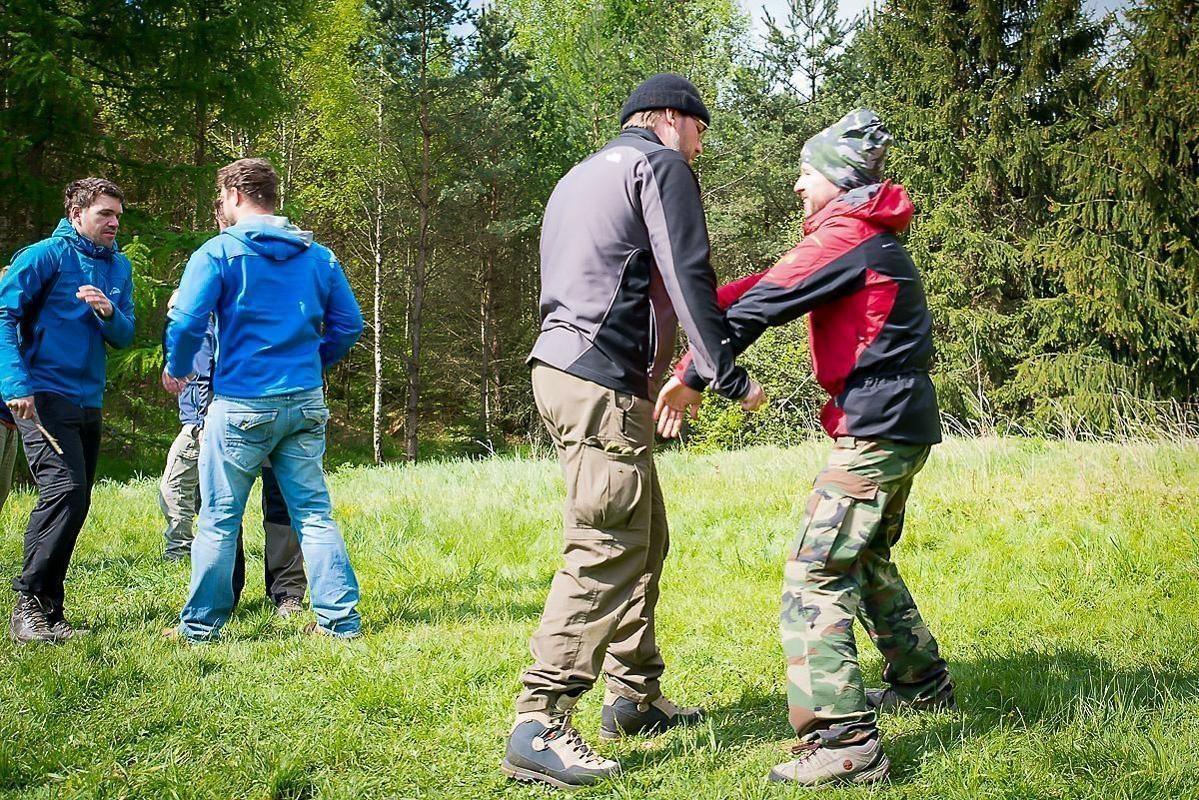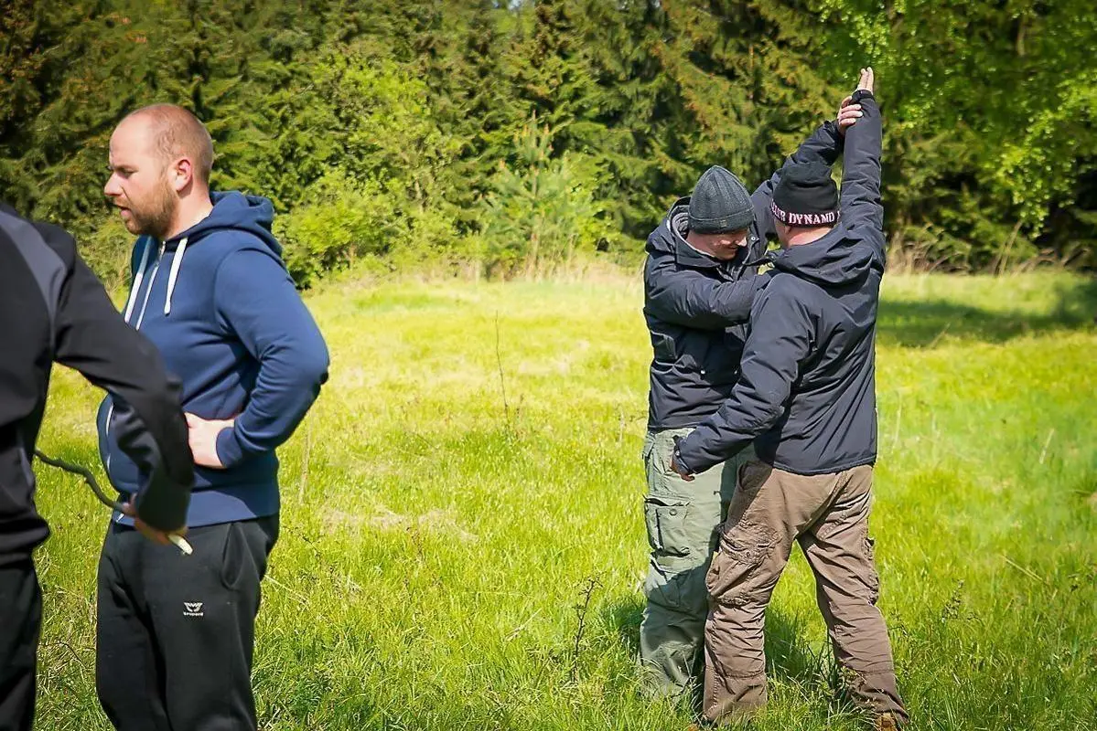 Die praktischen Übungen umfassten auch das Interagieren mit anderen Teilnehmern, um Techniken zur Handfixierung und Kontrolle zu erlernen. Diese Aspekte waren wichtig, um ein Gefühl für Distanz und Kontrolle im Nahkampf zu bekommen. Insgesamt bot der Kurs eine umfassende Einführung in die Survival-Basics und förderte das Vertrauen der Teilnehmer in ihre Fähigkeiten, in der Natur zu bestehen.