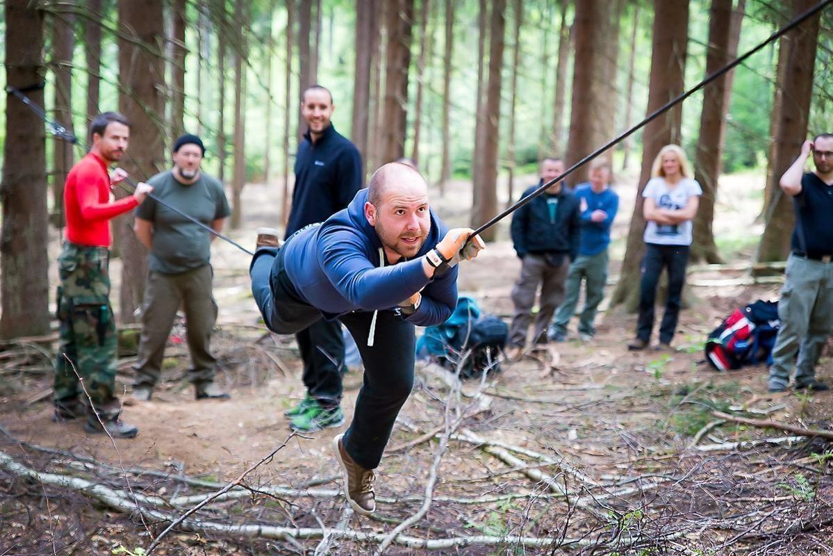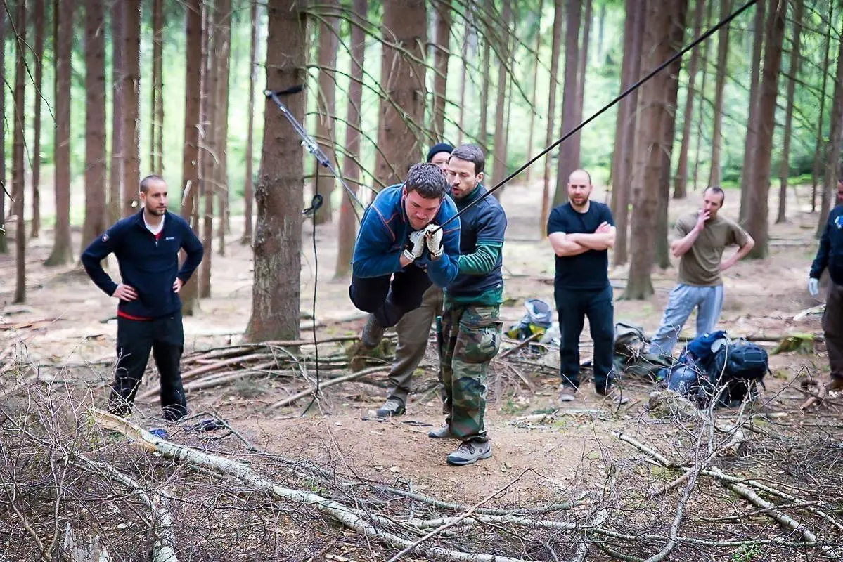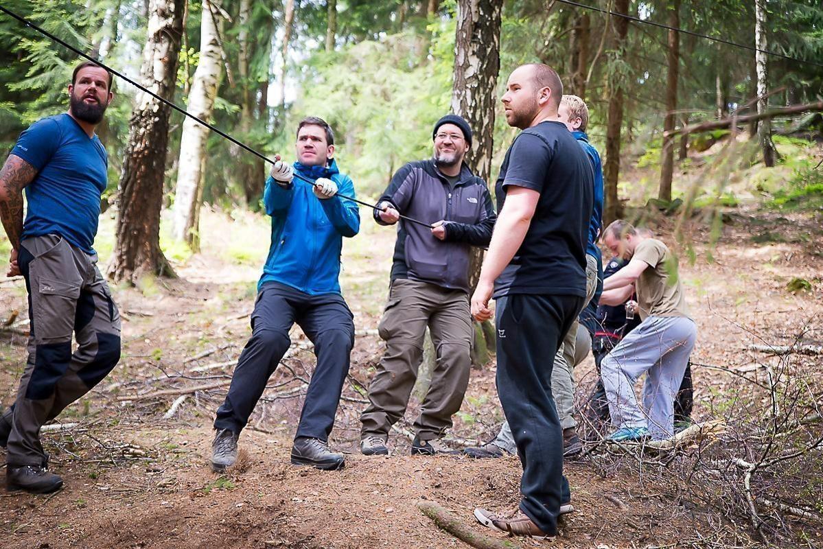 Gruppierung zieht an einem Seil in einem Waldgebiet zwischen Bäumen
