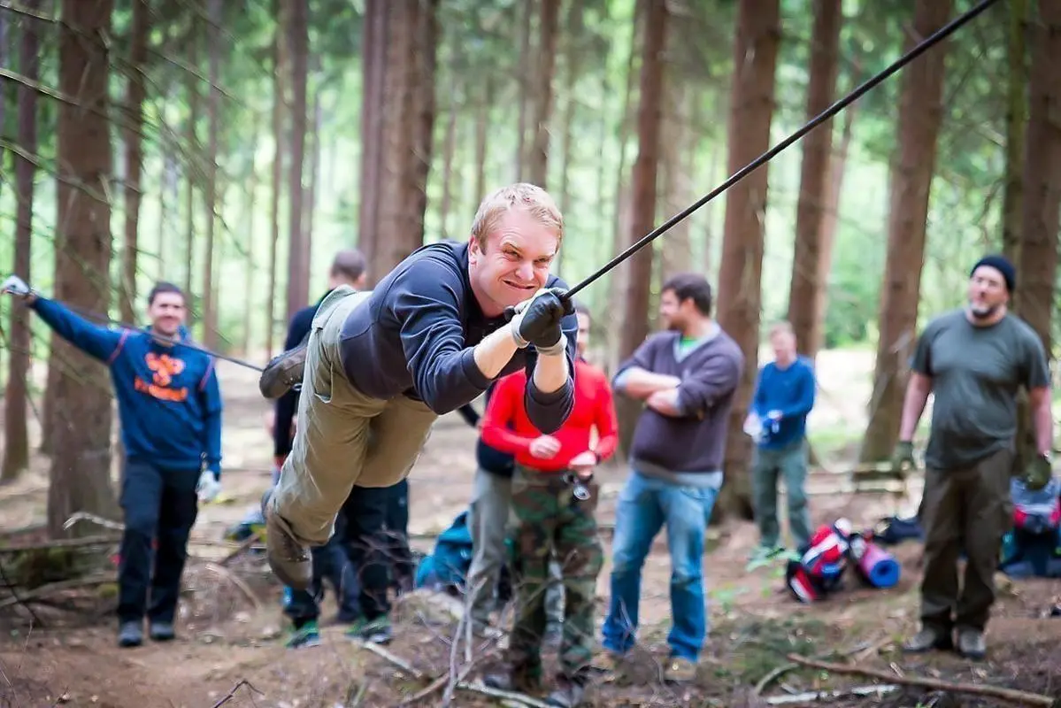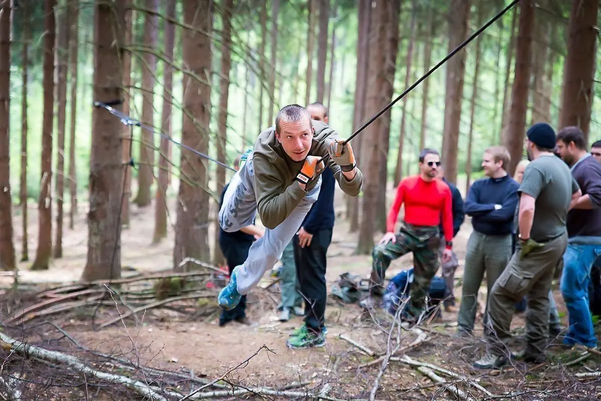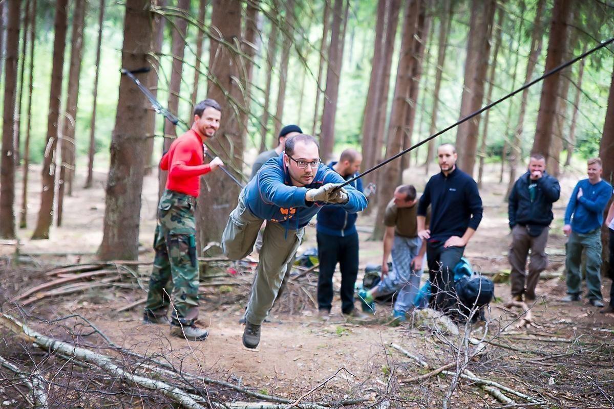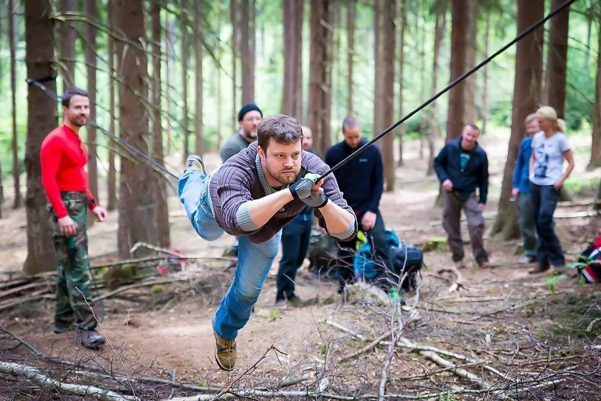 Gruppierung zieht an einem Seil in einem Waldgebiet zwischen Bäumen