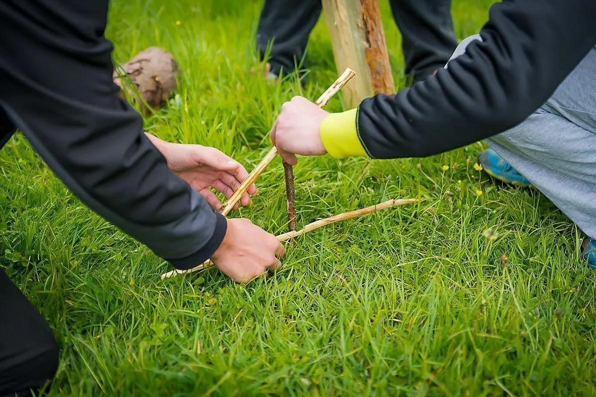 Hände formen eine Schlagfalle (Figure-Four) aus Ästen auf dem Gras