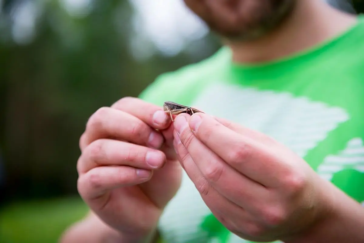 Mann mit einem Insekt im Mund steht in einer grünen Umgebung