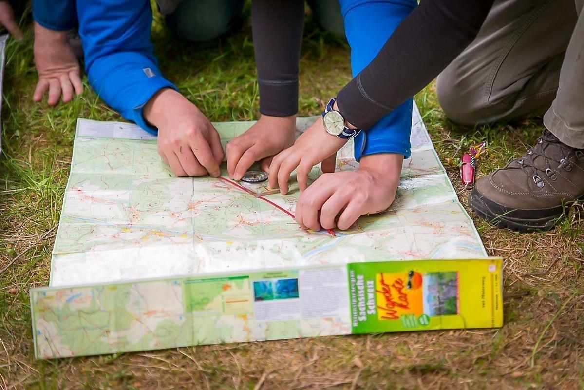 Hände legen einen Stock auf eine Karte zur Orientierung