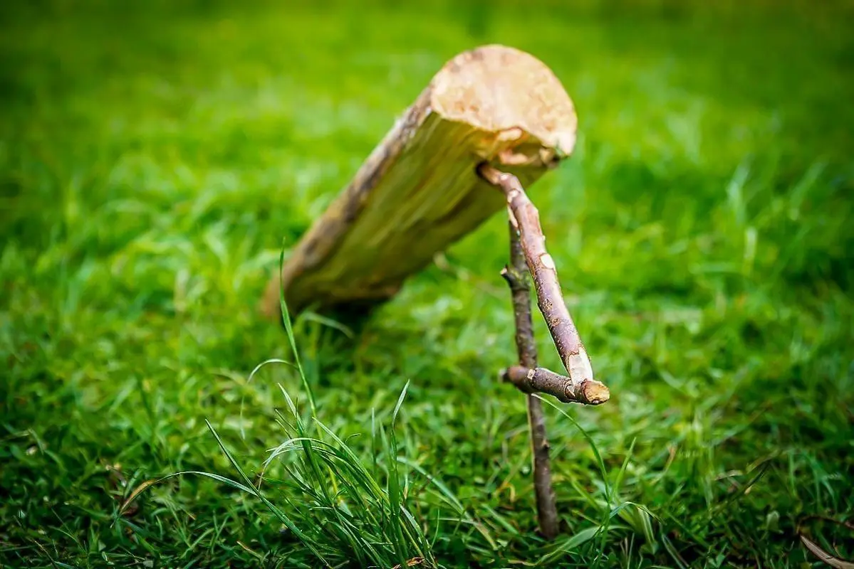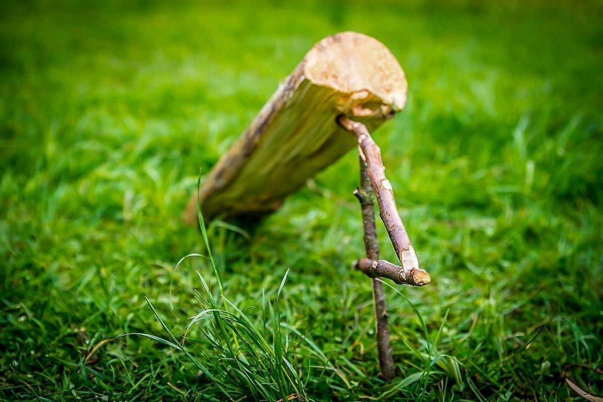 Holzstück mit einem schrägen Stock als Stütze auf grünem Gras