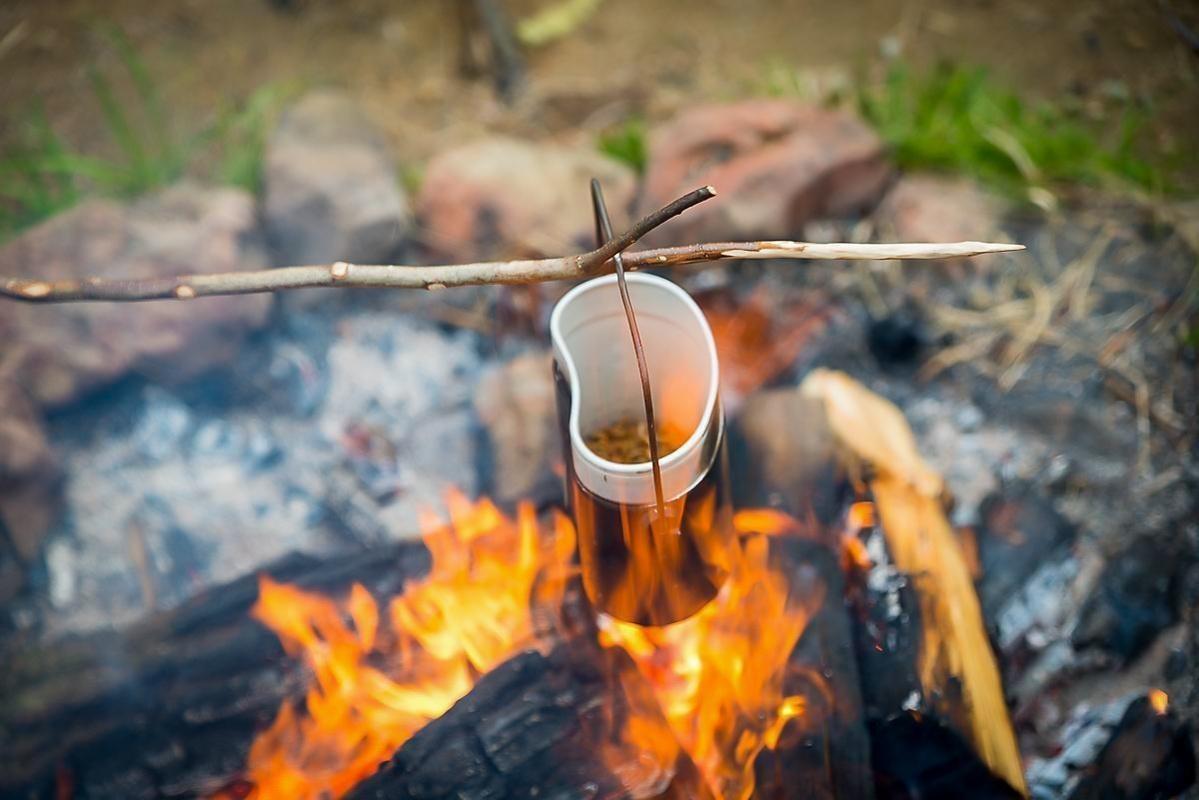 Kessel hängt über dem Feuer an einer improvisierten Halterung aus Ästen