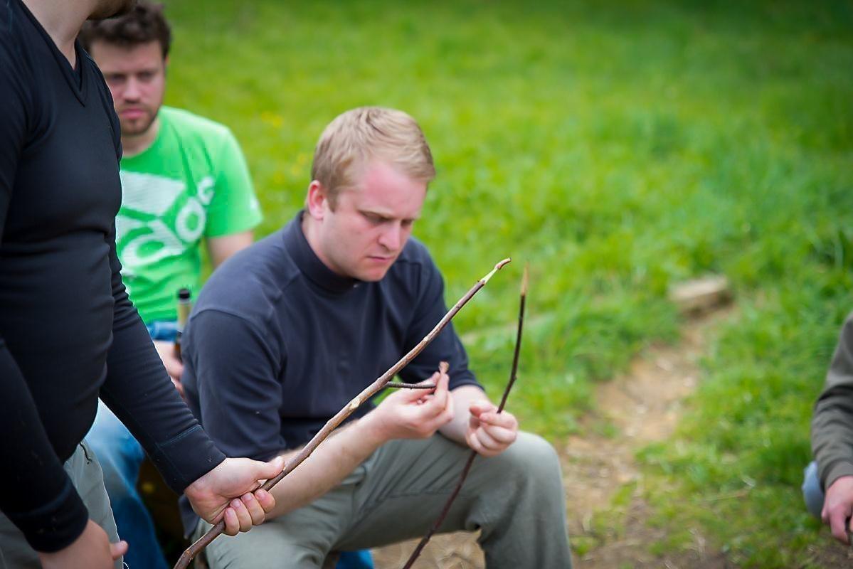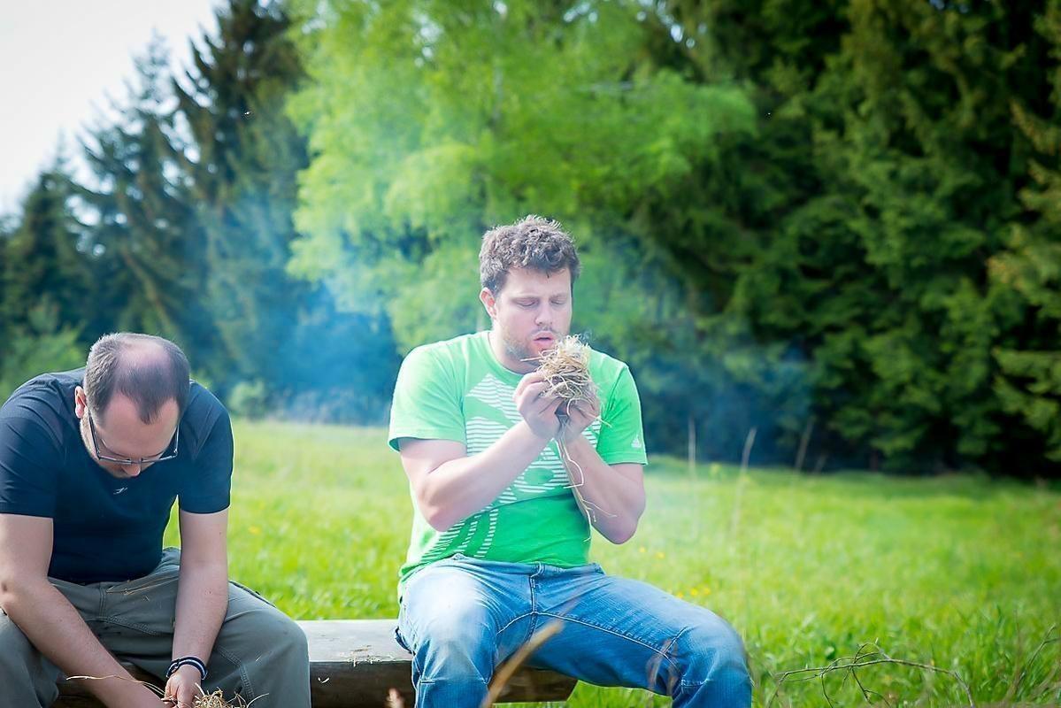 Mann formt Zundernest aus Gras, während zwei weitere Männer beobachten