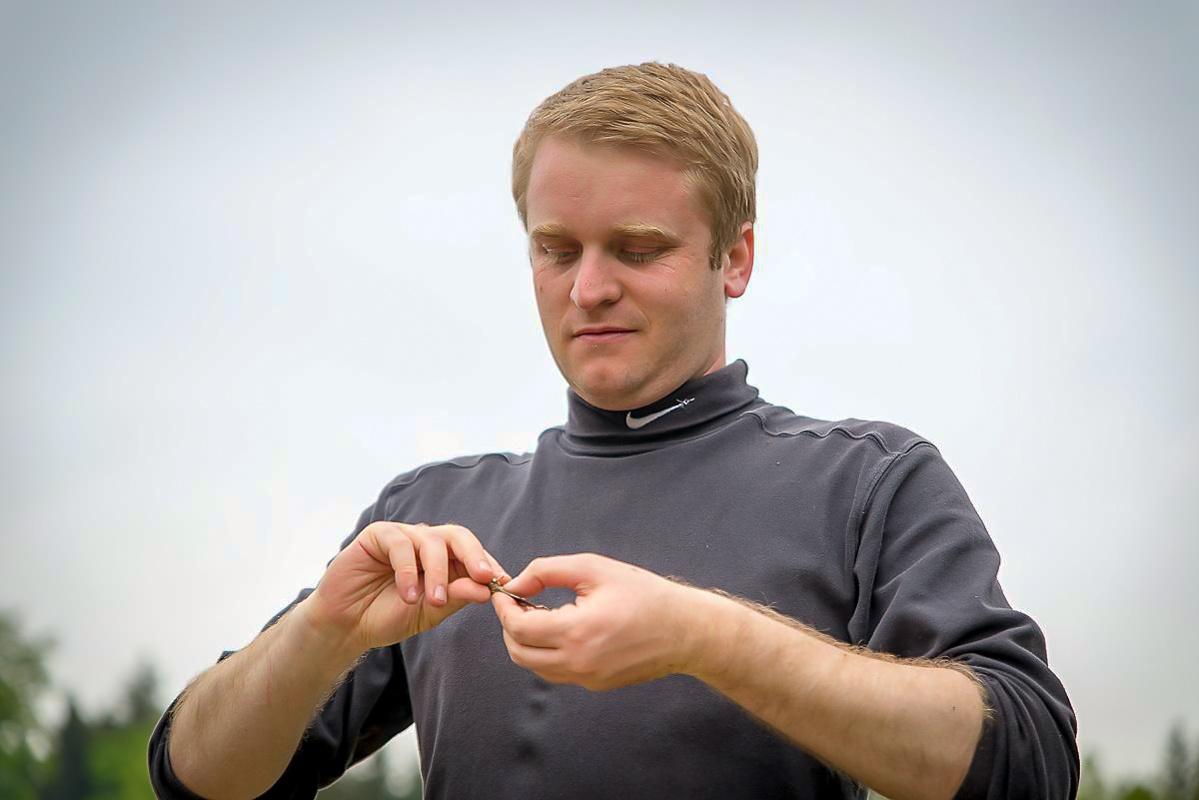 Mann hält einen kleinen Gegenstand zwischen den Fingern und konzentriert sich darauf