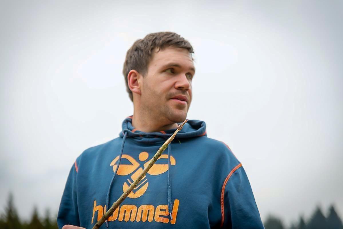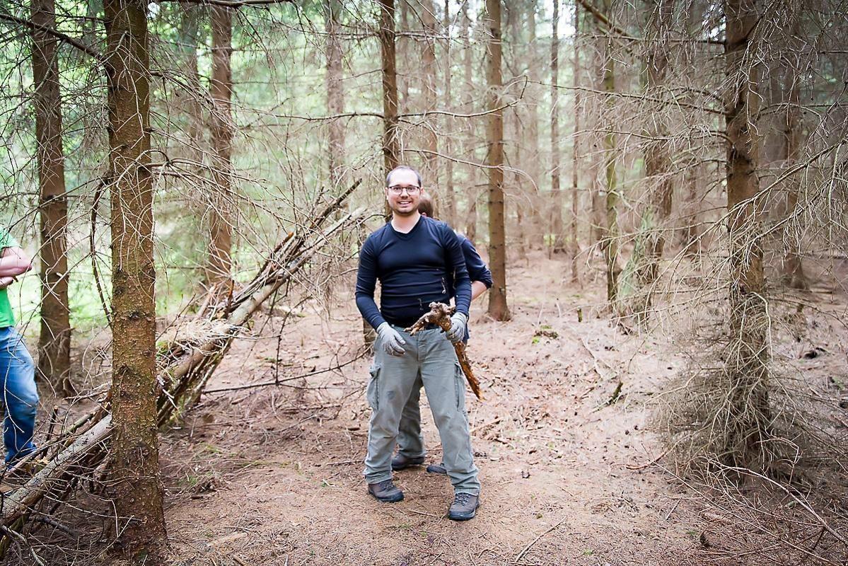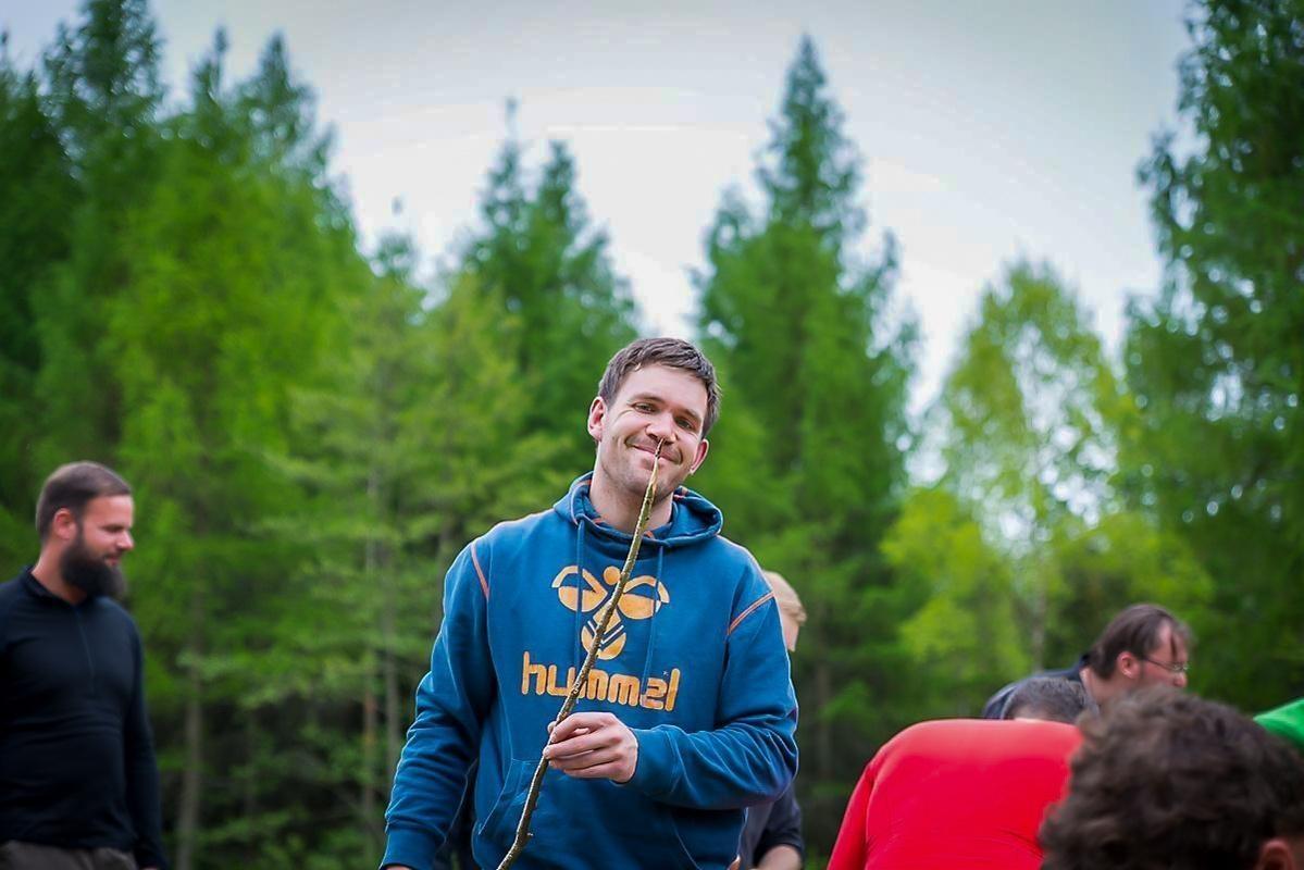 Mann hält einen Stock in der Hand und lächelt in einer Waldumgebung