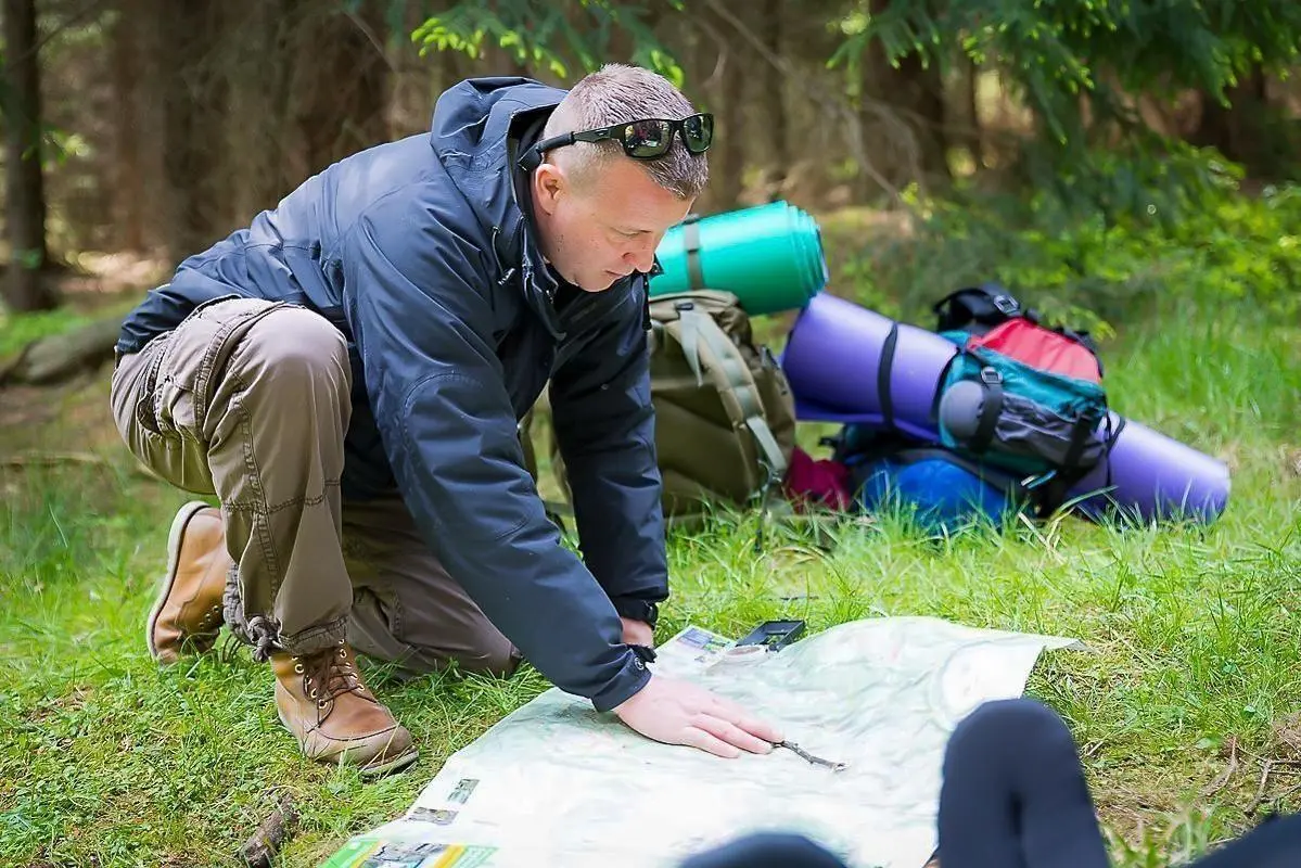 Mann kniet neben einer Karte und untersucht diese im Freien