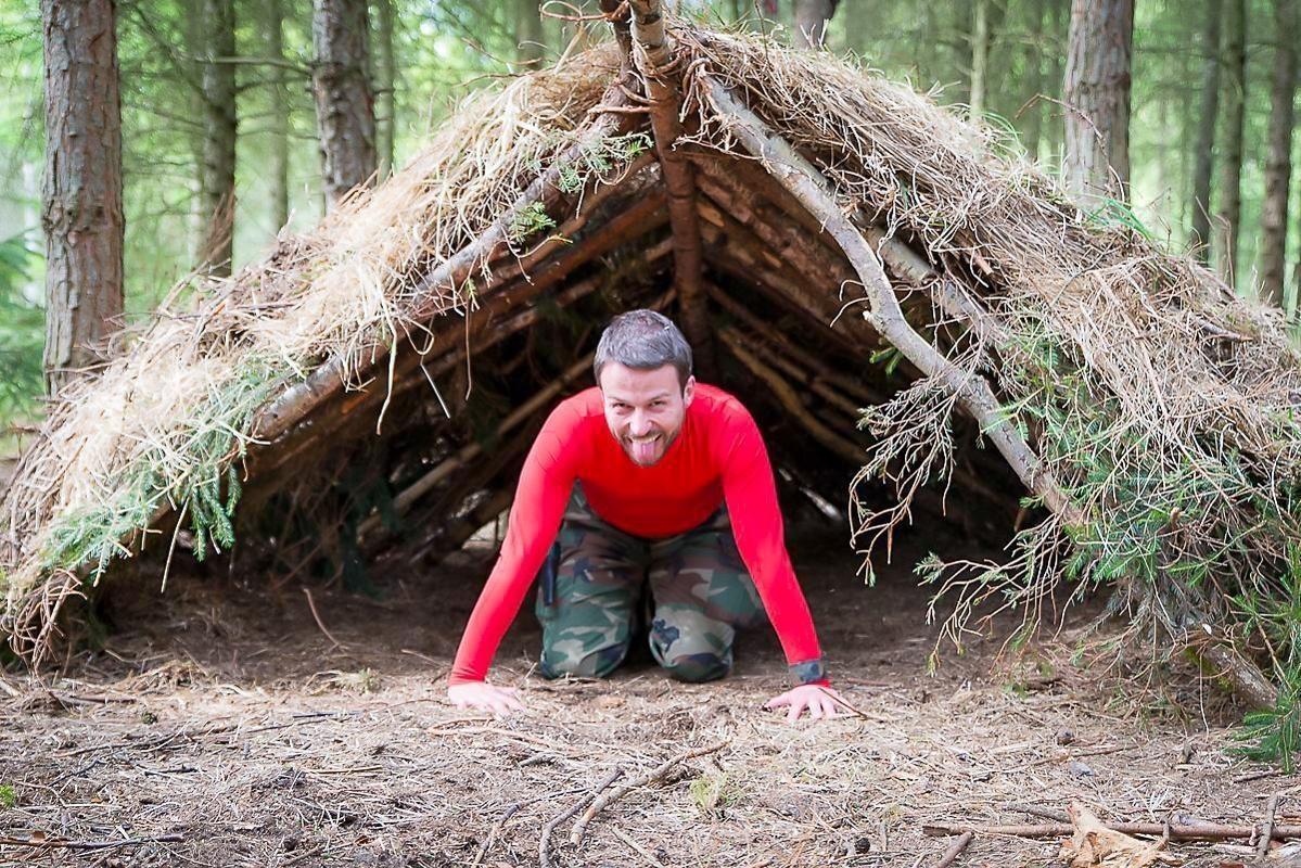 Mann kriecht aus einer selbstgebauten Laubhütte im Wald