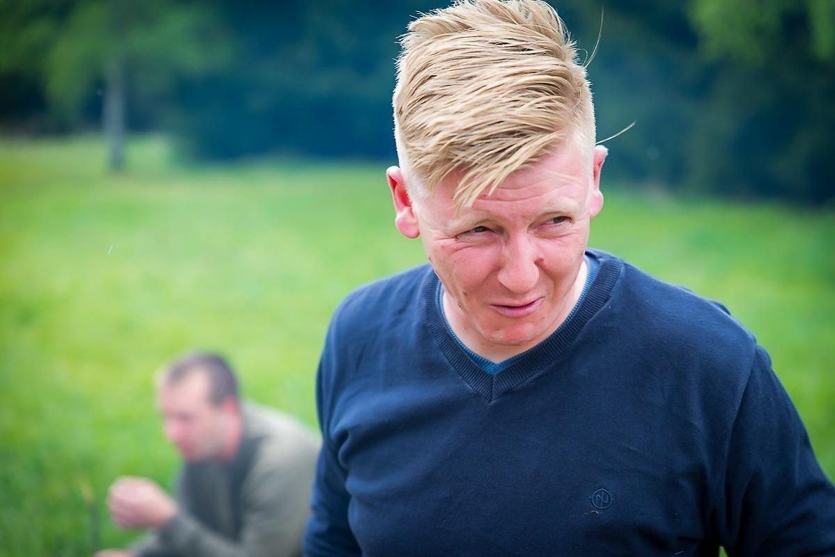 Mann mit kurzem, blondem Haar steht in einer Wiese, im Hintergrund sitzt eine weitere Person